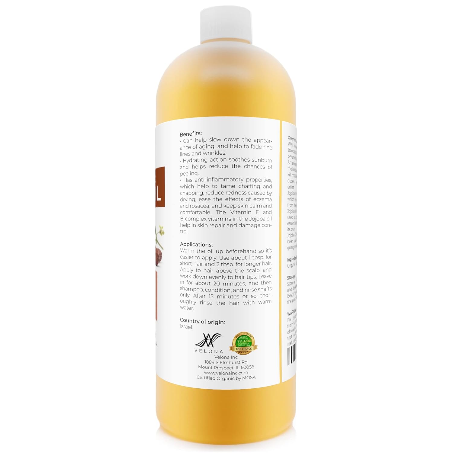 velona Jojoba Oil USDA Certified Organic - 32 oz (With Pump) | 100% Pure and Natural Carrier Oil| Golden, Unrefined, Cold Pressed, Hexane Free