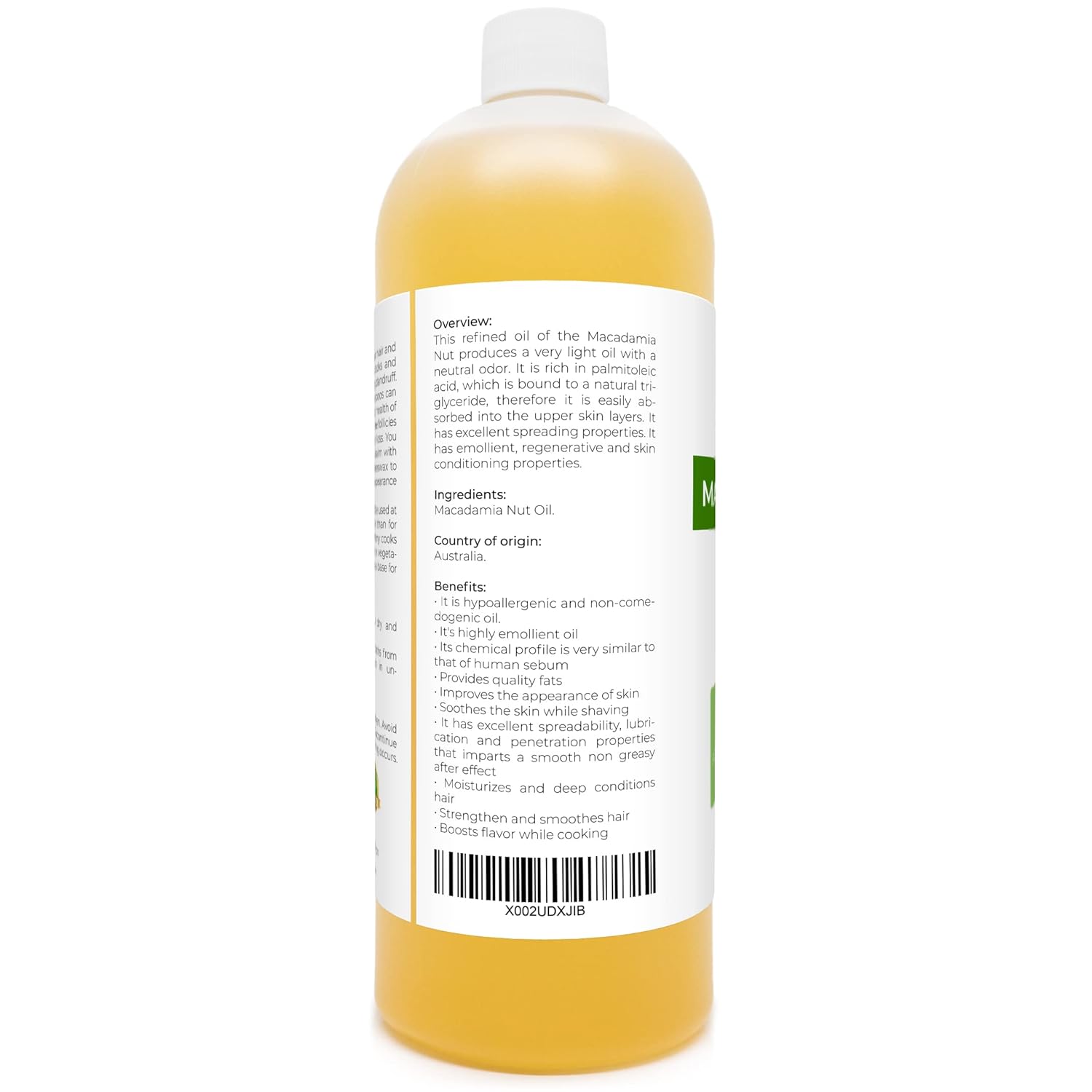 Macadamia Oil: 100% Pure and Natural Carrier Oil. Refined. Expeller Pressed. Not Diluted, Non-GMO, No Additives, No Fragrance, Chemical Free, Alcohol Free. All our products are bottled in the USA