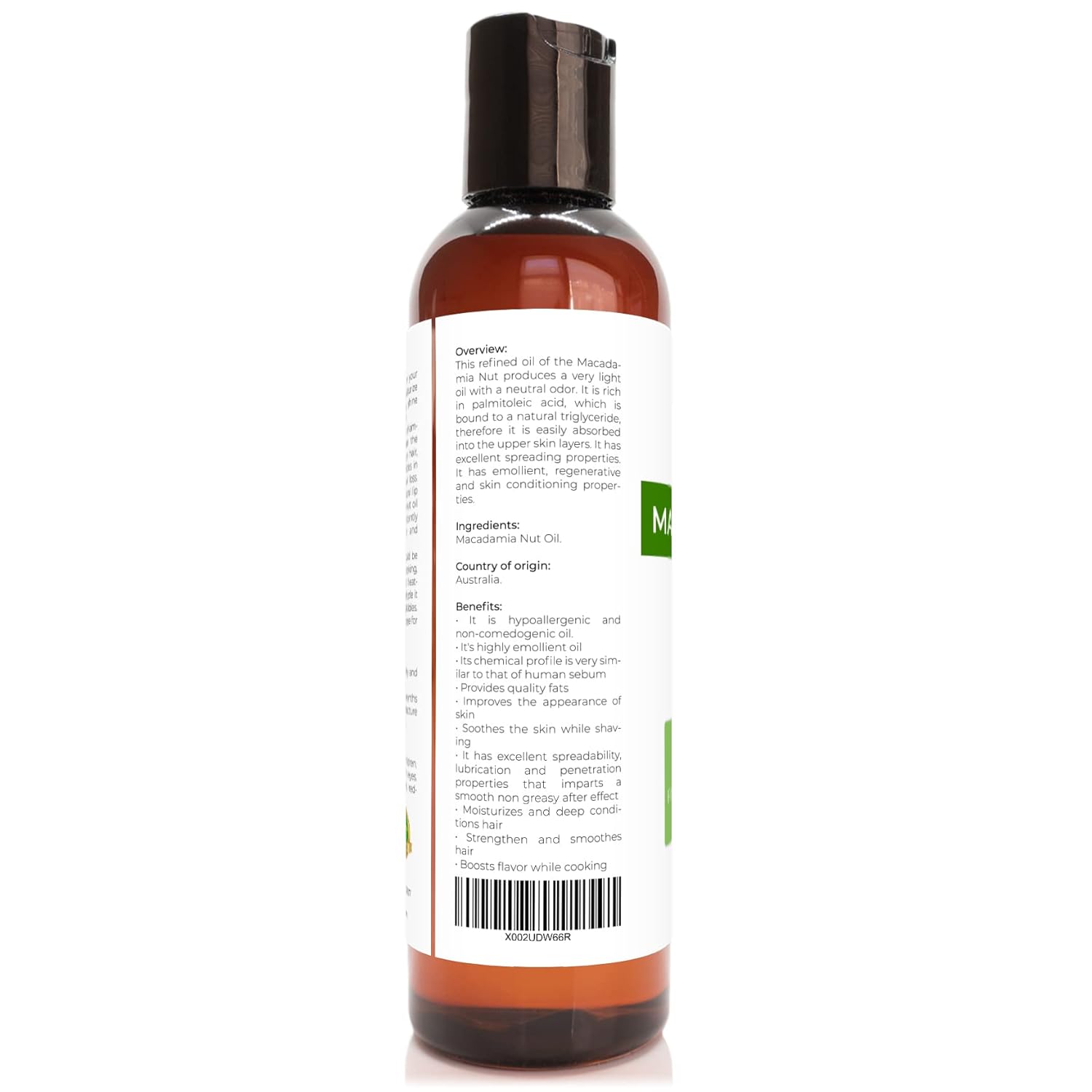 Macadamia Oil: 100% Pure and Natural Carrier Oil. Refined. Expeller Pressed. Not Diluted, Non-GMO, No Additives, No Fragrance, Chemical Free, Alcohol Free. All our products are bottled in the USA