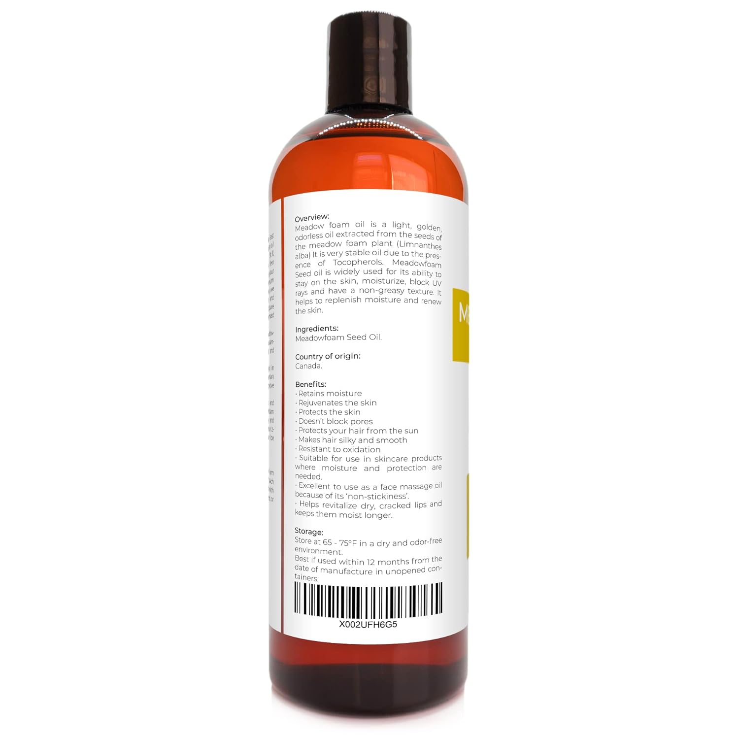Meadowfoam Oil: 100% Pure and Natural Carrier Oil. Refined. Expeller Pressed. Not Diluted, Non-GMO, No Additives, No Fragrance, Chemical Free, Alcohol Free. All our products are bottled in the USA