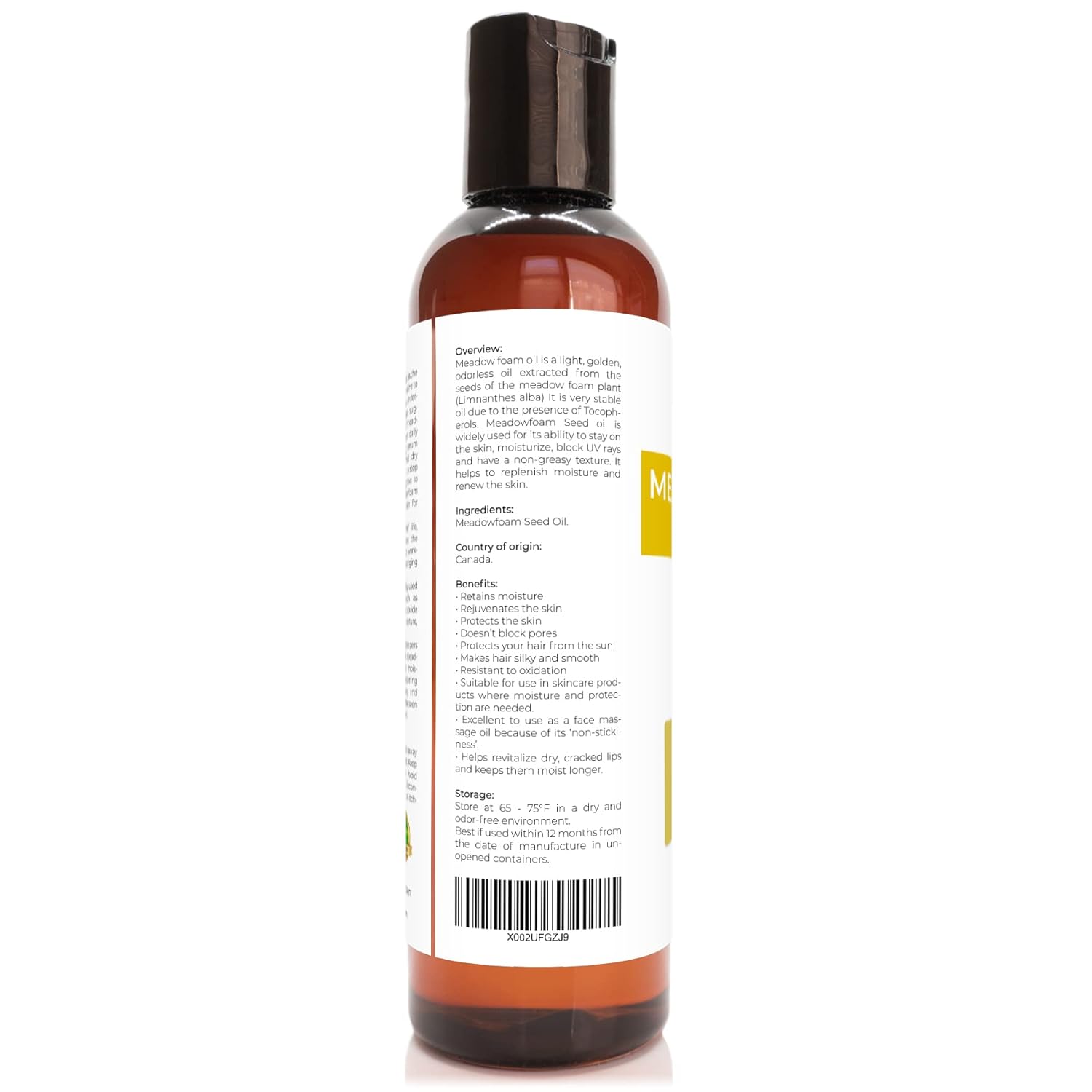 Meadowfoam Oil: 100% Pure and Natural Carrier Oil. Refined. Expeller Pressed. Not Diluted, Non-GMO, No Additives, No Fragrance, Chemical Free, Alcohol Free. All our products are bottled in the USA