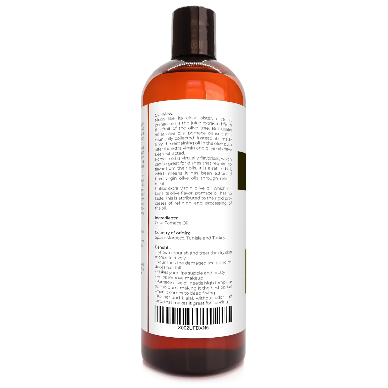 Olive Oil Pomace: 100% Pure and Natural Carrier Oil. Refined. Cold Pressed. Not Diluted, Non-GMO, No Additives, No Fragrance, Chemical Free, Alcohol Free. All our products are bottled in the USA