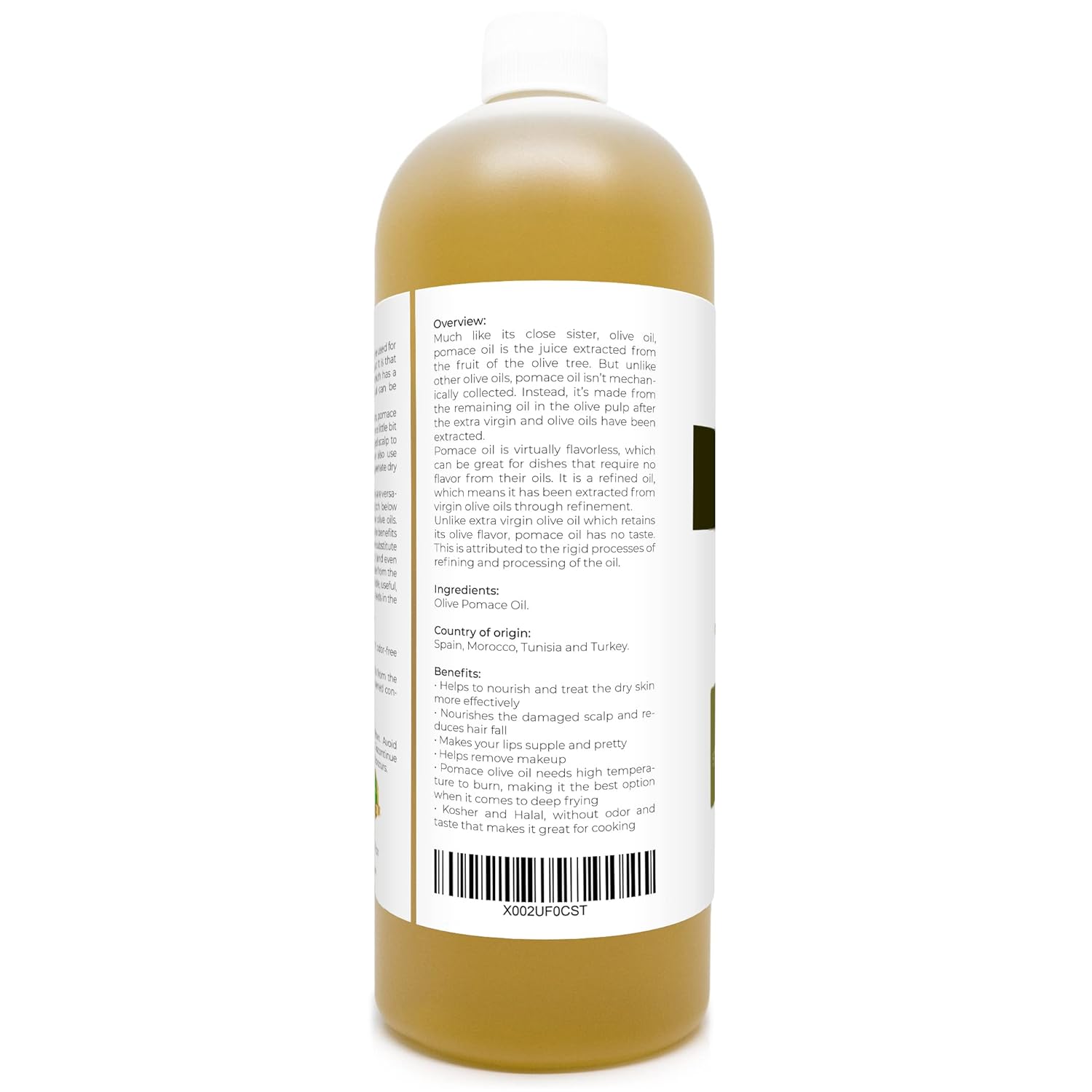 Olive Oil Pomace: 100% Pure and Natural Carrier Oil. Refined. Cold Pressed. Not Diluted, Non-GMO, No Additives, No Fragrance, Chemical Free, Alcohol Free. All our products are bottled in the USA