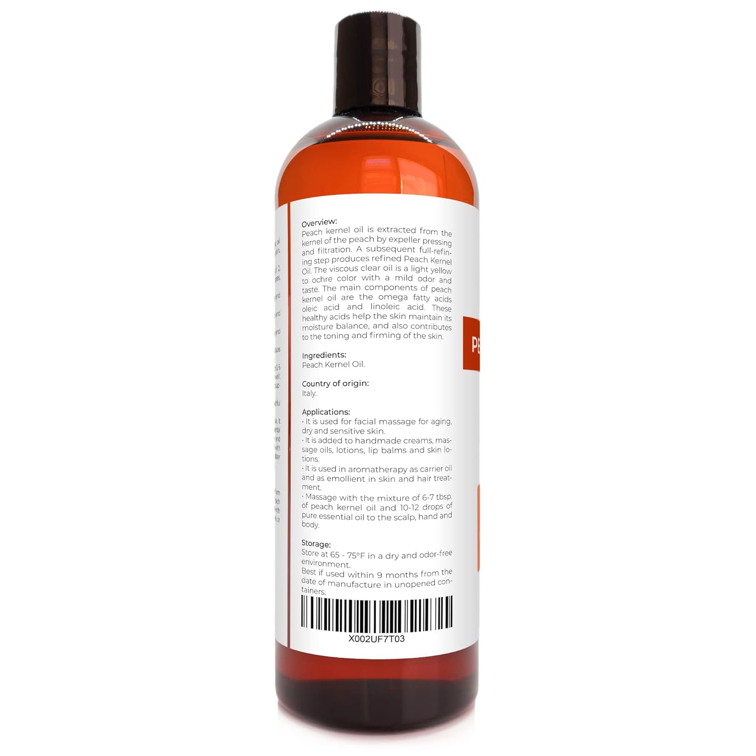 Peach Kernel Oil: 100% Pure and Natural Carrier Oil. Refined. Expeller Pressed. Not Diluted, Non-GMO, No Additives, No Fragrance, Chemical Free, Alcohol Free. All our products are bottled in the USA