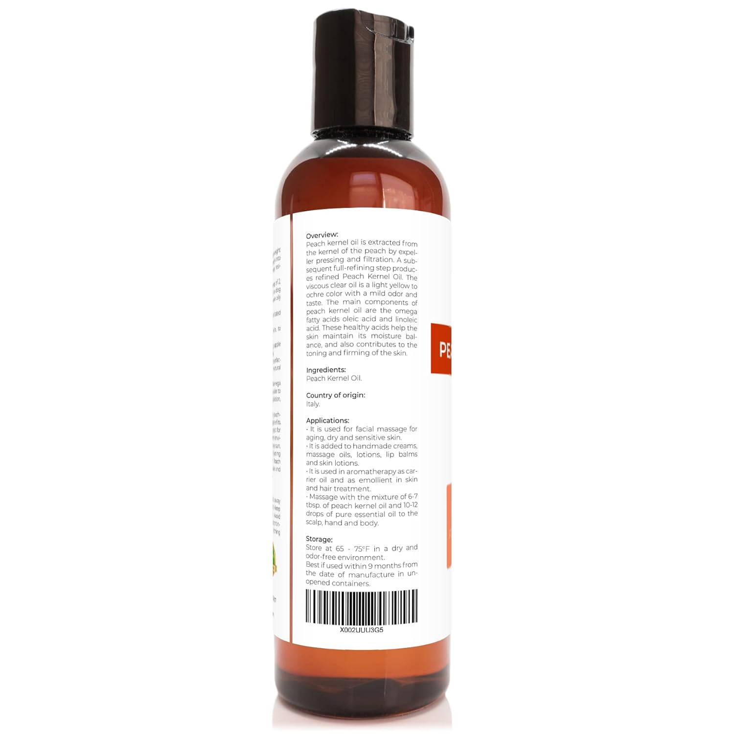 Peach Kernel Oil: 100% Pure and Natural Carrier Oil. Refined. Expeller Pressed. Not Diluted, Non-GMO, No Additives, No Fragrance, Chemical Free, Alcohol Free. All our products are bottled in the USA