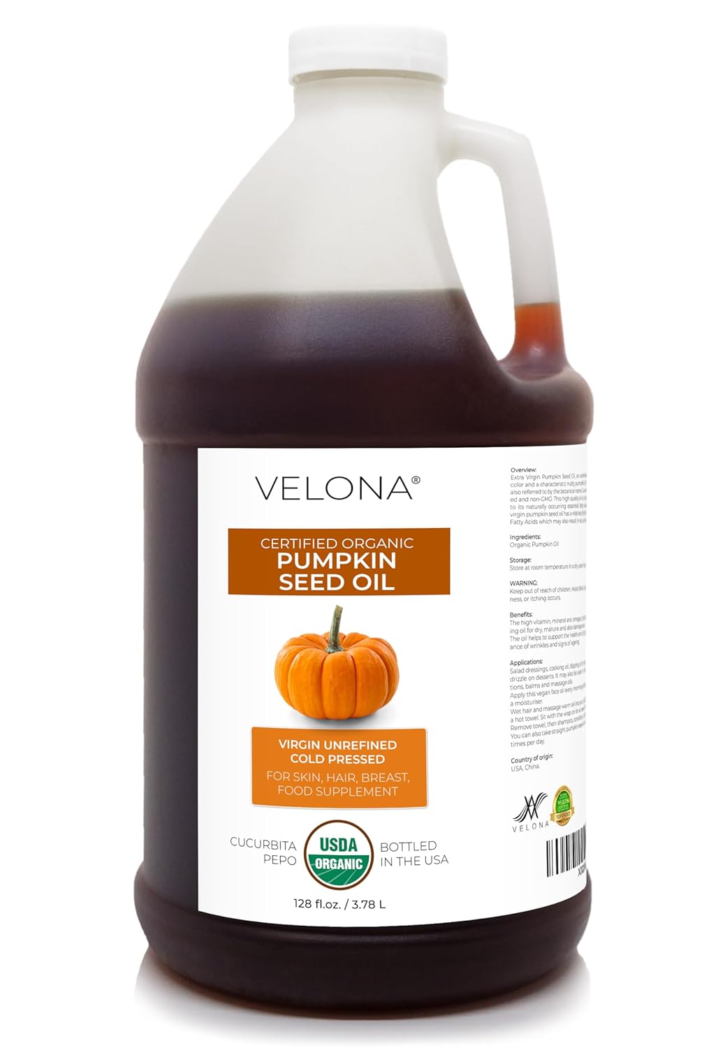 velona Pumpkin Seed Oil USDA Certified Organic - 128 oz | 100% Pure and Natural Carrier Oil | Unrefined, Cold Pressed | Cooking, Face, Hair, Body & Skin Care | Use Today - Enjoy Results