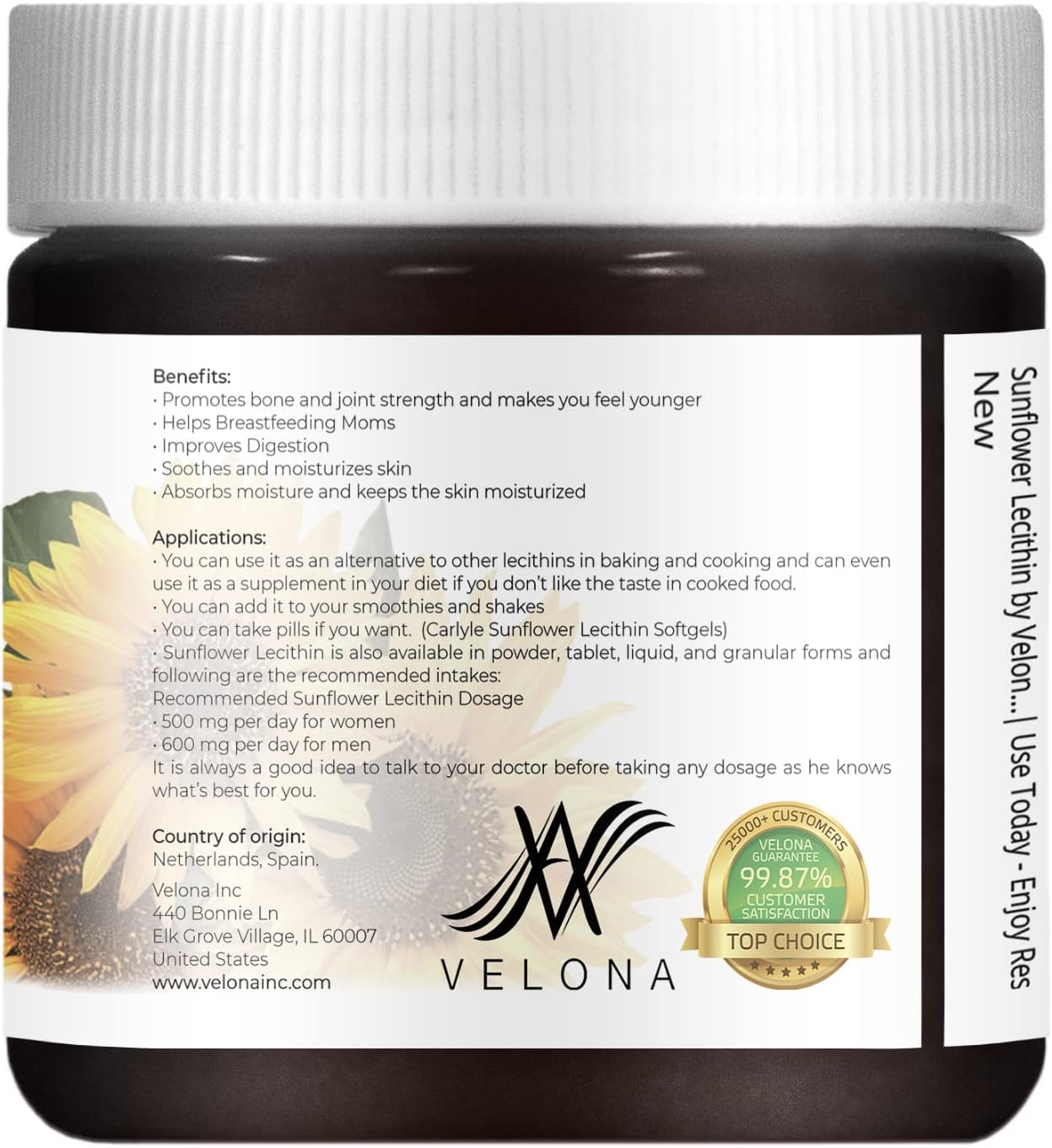 Velona Pure Liquid Sunflower Lecithin 4 Oz | Food Grade | Unbleached | Emulsifier, Stabilizer, Softener, Smoother, Wetting Agent | Use Today - Enjoy Results