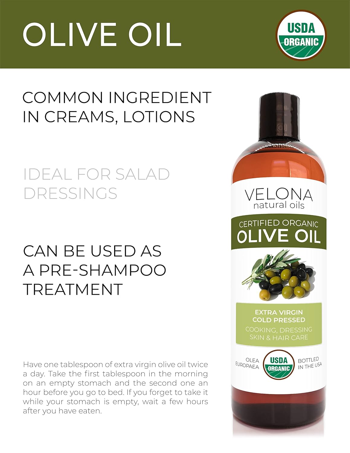velona USDA Certified Organic Olive Oil - 4 oz | 100% Pure and Natural Carrier Oil | Extra Virgin, Unrefined, Cold Pressed