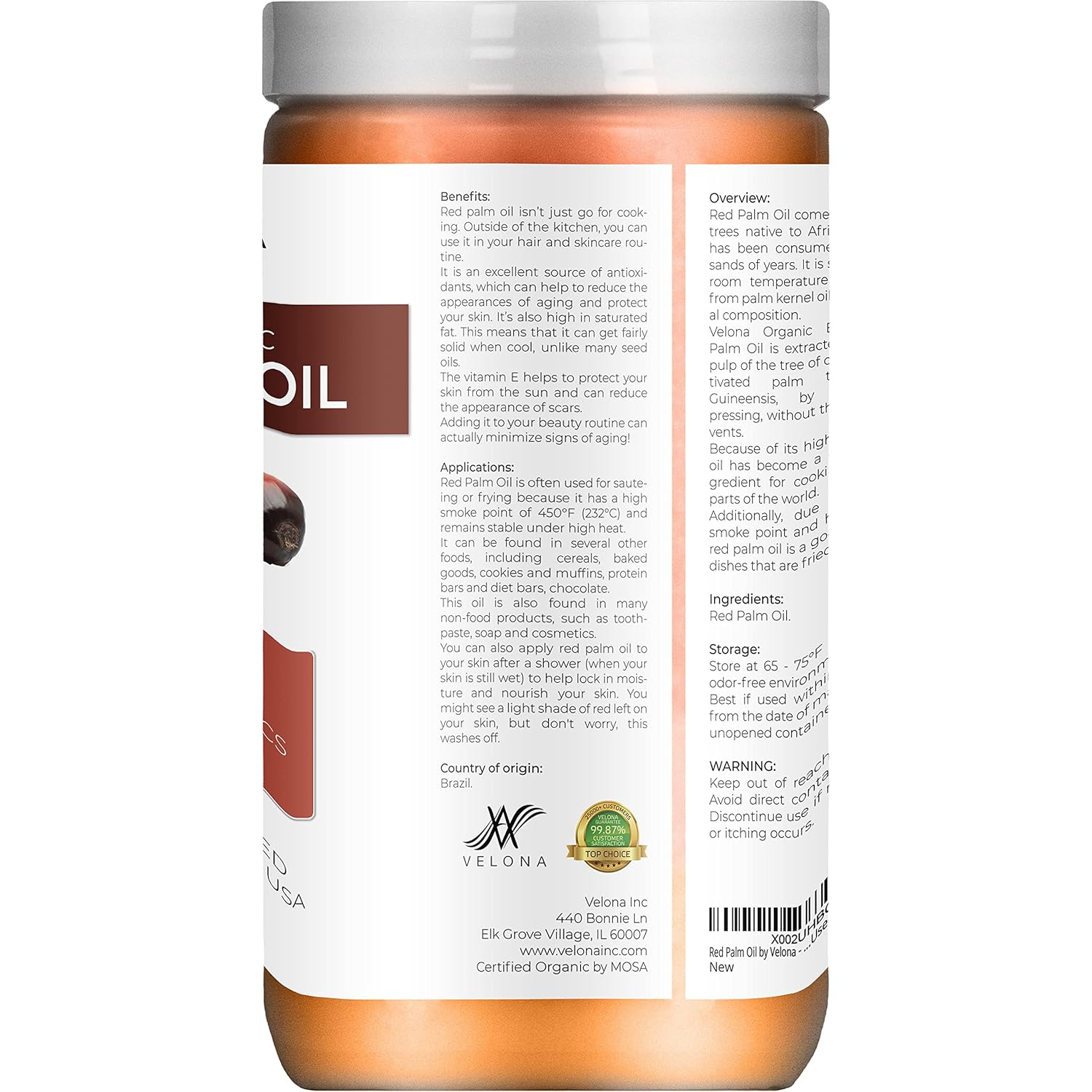 Velona USDA Organic Red Palm Oil comes from palm trees native to Africa, where it has been consumed for thousands of years. It is semi-solid at room temperature and differs from palm kernel oil in nutritional composition. Velona UDSA Organic Extra Virgin Red Palm Oil is extracted from the pulp of the tree of organic â cultivated palm tree Elaeis Guineensis, by mechanical pressing, without the use of solvents. Because of its high yield, palm oil has become a common ingredient for cooking in many parts of the world. Additionally, due to its high smoke point and heat stability, red palm oil is a good choice for dishes that are fried or sautĂ©ed. IMPORTANT! We sell our products by weight, not by volume! That is, different kind of oils might have different volume while the same bottle size and weight as they have different viscosity. Product Specifications Common Name: Red Palm Oil Botanical Name: Elaeis Guineensis Country of Origin: Brazil. Extraction Method: Cold Pressed Plant Part: Palm fruit pulp Oil Color: Dark red Flavor / Odor / Aroma: Bold, vegetal, paprika-like flavor 100% Pure & Natural Only One Ingredient: Our premium Velona USDA Organic Red Palm Oil is 100% Pure & Natural â No Additives, No Chemicals, No Alcohol, No Fragrance, and Not Diluted. Non-GMO. Made without pesticides. Frequently Asked Questions Q: Is it really 100% pure What are the ingredients Yes! there is only one ingredient: 100% Pure & Natural Velona USDA Organic Rec Palm Oil (Elaeis Guineensis). Q: Is it certified organic Yes, we're certified ORGANIC by Midwest Organic Services Association. Q: Which products contain red palm oil About 80% of the palm oil produced is used in the food industry globally. It can be found in: margarine, fats for baking, pastries, biscuits, ice cream and various other kinds of foods. Q: Why is palm oil used Palm oil has specific functional properties that make it an important ingredient in food manufacturing. Importantly, palm oil virtually contains no trans fatty acids. Q: Would it be better to stop using palm oil No, palm oil is the most efficient of the vegetable oils, meaning that you can usually produce more food from a hectare of oil palm than with any crop, and need a lot less fertiliser to do so. What are carrier oils âCarrier Oilâ is a term generally used in the contexts of aromatherapy and cosmetic recipes for natural skin and hair care. Carrier oils and essential oils are made from plants. Carrier oils are used to dilute essential oils and âcarryâ them to your skin. Thatâs because essential oils are potent and can cause irritation when applied directly to your skin. A Carrier Oil is a vital aspect of an aromatherapy massage or a natural cosmetic such as a soap, bath oil, body oil, cream, lip balm, lotion, or other moisturizer, as it can affect the usefulness of the massage and the color, scent, therapeutic properties, and shelf life of the final product, respectively. Most carrier oils are unscented or lightly scented and donât interfere with an essential oilâs therapeutic properties. They may be used alone or with other oils to nourish your skin. Cold Pressing It is a chemical-free process that involves placing the nuts or seeds in a horizontal press that has an 'expeller,' which is a rotating screw. The screw drives the nuts and seeds through a barrel-shaped hollow and compresses them until the high pressure squeezes out the oil, which seeps out through the opening, while the âmeal,â or the debris, remains inside the barrel. The oil is then filtered, resulting in the finished product. Due to the absence of solvent residues in Cold Pressing, the outcome is cleaner, purer oils that are higher in natural colors and scents. (function(f) {var _np=(window.P._namespace("AplusModule"));if(_np.guardFatal){_np.guardFatal(f)(_np);}else{f(_np);}}(function(P) { // register javascript with unique module id P.when("jQuery", "AplusModules-module-6", "ready").execute(function($, hoverModule) { hoverModule("aplus-module-6-3"); }); })); Benefits & Uses Zero Cholesterol This is the most important benefit provided by palm kernel oil. This makes it a perfect replacement for lard and butter in the cooking process. People with high cholesterol and heart problems can easily switch over to palm oil. Antioxidants With a sufficient amount of Vitamin E, rarely found tocotrienols and being loaded with anti-oxidants, palm oil provides amazing anti-aging benefits. It may slow the occurrence of wrinkles and fine lines. It is capable of providing protection against harmful UV rays and other toxins. Therefore, it is wise to include palm kernel oil in your daily diet. It will keep your skin great and youthful. Hair Growth Palm kernel oil shows amazing results on hair growth. It provides thorough conditioning, thickens hair and decrease hair fall by making it stronger. Used topically, it provides a soothing effect along with the desired nourishment. Naturally Soft Skin Besides the amazing anti-aging benefits provided by the palm kernel oil, it also makes the skin naturally soft and glossy without it getting a greasy appearance. This is the reason the oil is a key ingredient in many soap bars and skin creams. It also helps with ragged cuticles and itchy skin. Babassu Oil 76 Degree Refined Coconut Oil 92 Degree Refined Coconut Oil Palm Kernel Organic Neem Oil Amla Oil See Details See Details See Details See Details See Details See Details Customer Reviews .aplus-v2 .aplus-review-right-padding { padding-right: 0.1rem; } 4.5 out of 5 stars 43 .aplus-v2 .aplus-review-right-padding { padding-right: 0.1rem; } 4.4 out of 5 stars 5 .aplus-v2 .aplus-review-right-padding { padding-right: 0.1rem; } 4.6 out of 5 stars 28 .aplus-v2 .aplus-review-right-padding { padding-right: 0.1rem; } 4.1 out of 5 stars 46 .aplus-v2 .aplus-review-right-padding { padding-right: 0.1rem; } â .aplus-v2 .aplus-review-right-padding { padding-right: 0.1rem; } â Price $9.59 $ 9 . 59 â â â â â 100% Pure & Natural Best for Skin and