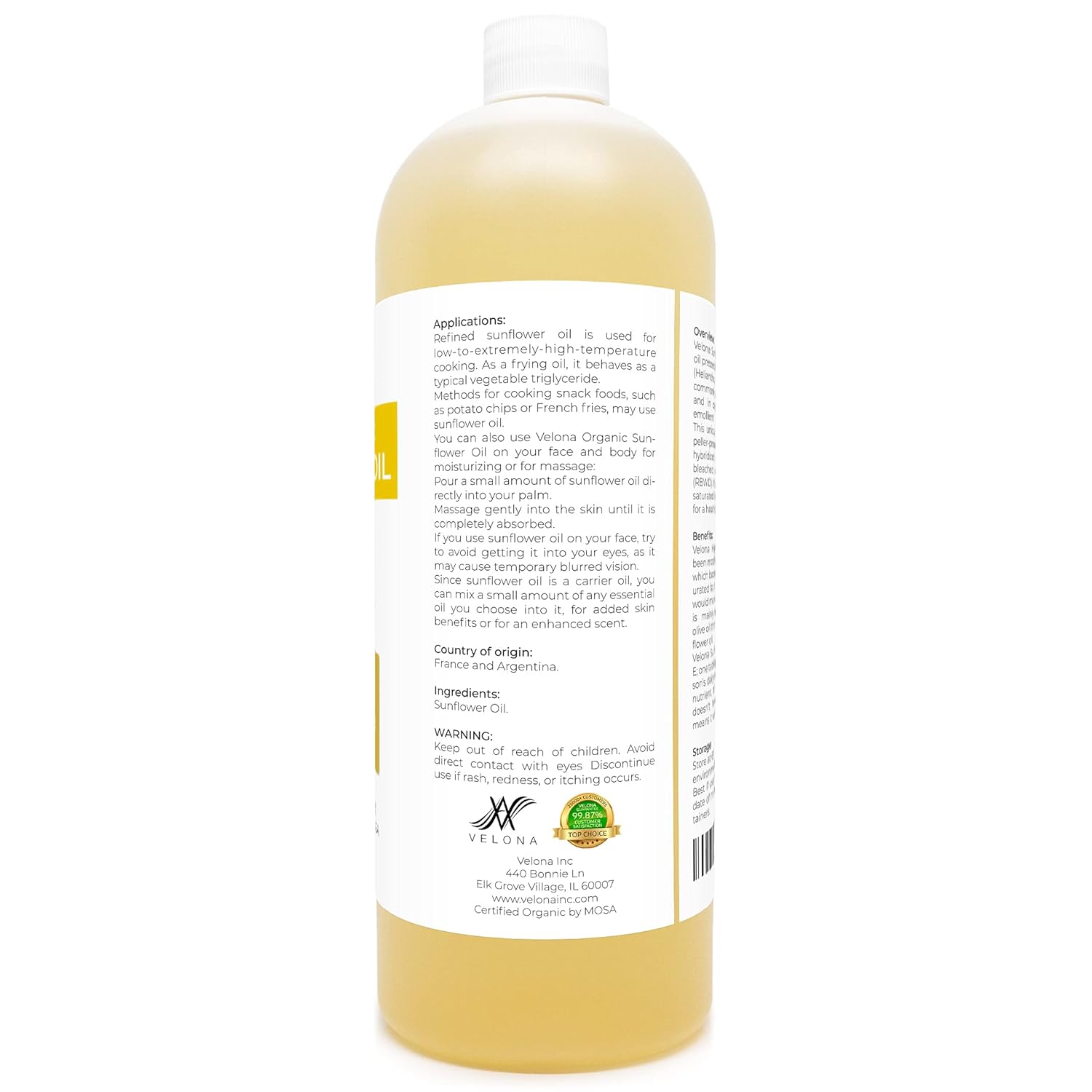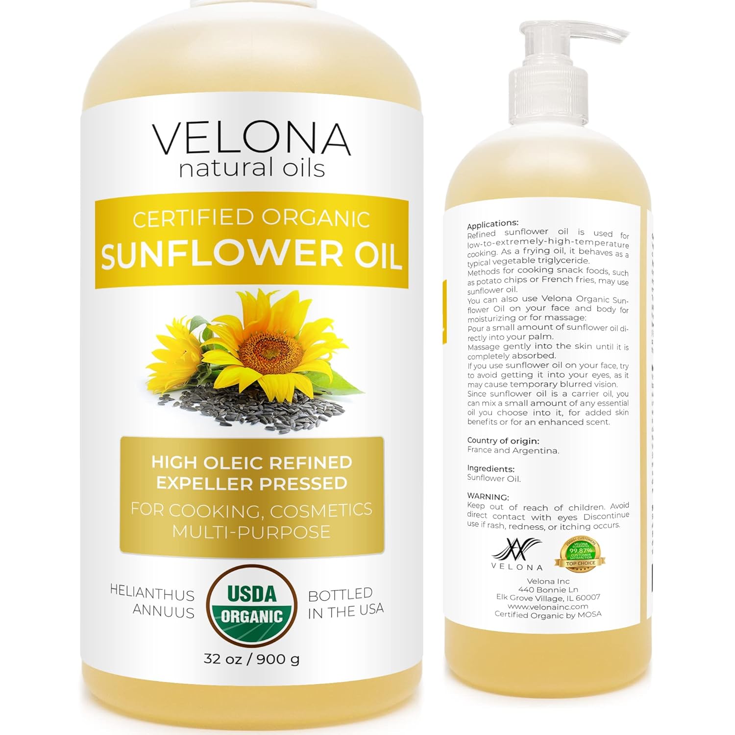 velona USDA Certified Organic Sunflower Oil - 32 oz | 100% Pure and Natural Carrier Oil | High Oleic, Refined, Cold Pressed | Cooking, Skin, Hair, Body & Face Moisturizing