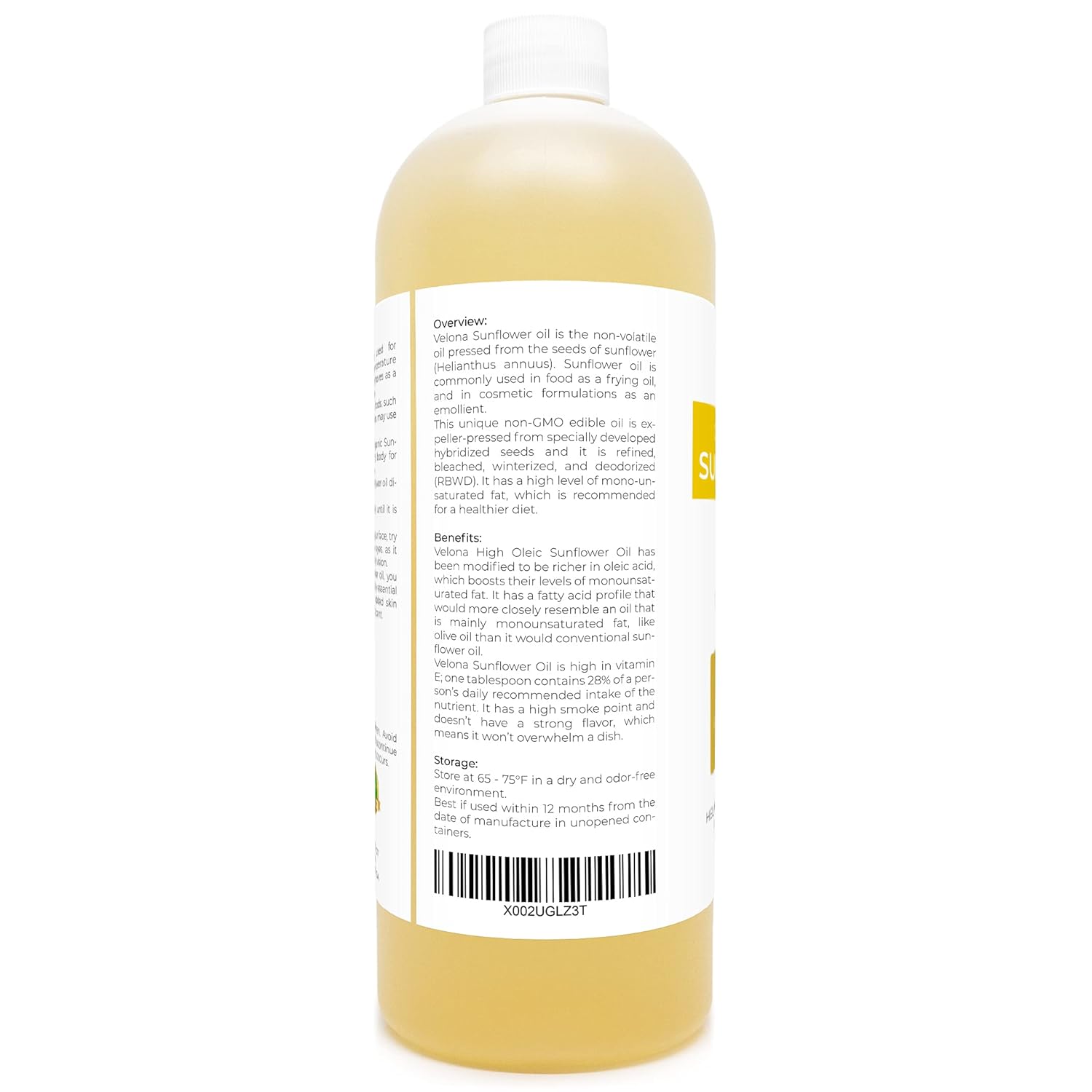 USDA Certified Organic High Oleic Sunflower Oil is expeller-pressed from specially developed hybridized non-GMO seeds. It is refined, bleached, winterized, and deodorized (RBWD) through a physical process yielding a superior and economical product. This product is identity-preserved and certified NATURAL. NATURAL High Oleic Sunflower oil has a high level of mono-unsaturated fat, which is implicated as part of a healthy diet. Product Specifications Common Name: Sunflower Oil Botanical Name: Helianthus Annuus Country of Origin: France and Argentina Extraction Method: Expeller Pressed Certification: USDA Certified Organic Plant Part: Sunflower seed Oil Color: Clear and slightly amber Flavor / Odor / Aroma: Neutral Refined sunflower oil is used for low-to-extremely-high-temperature cooking. As a frying oil, it behaves as a typical vegetable triglyceride. Methods for cooking snack foods, such as potato chips or French fries, may use sunflower oil. You can also use Velona Organic Sunflower Oil on your face and body for moisturizing or for massage: Pour a small amount of sunflower oil directly into your palm. Massage gently into skin until it is completely absorbed. If you use sunflower oil on your face, try to avoid getting it into your eyes, as it may cause temporarily blurred vision. Since sunflower oil is a carrier oil, you can mix a small amount of any essential oil you choose into it, for added skin benefits or for an enhanced scent. 100% Pure & Natural Only One Ingredient: Our premium Sunflower Oil is 100% Pure & Natural – No Additives, No Chemicals, No Alcohol, No Fragrance and Not Diluted. Non-GMO. Made without pesticides. Frequently Asked Questions Q: Is it really 100% pure What are the ingredients Yes! There is only one ingredient: 100% Pure & Natural Sunflower Oil (Helianthus Annuus). Q: What are the storage conditions of the sunflower oil All vegetable oils have three enemies: light, oxygen and heat. That is why they should be stored in tightly closed containers and away from heat and light sources. Q: What is the shelf life of sunflower oil Best if used within 12 months. Q: What are the contraindications to the use of sunflower oil There are almost no contraindications. The main thing is not to use too much sunflower oil. Q: What not to do with sunflower oil Never reuse oil after frying. When heated, toxic compounds are formed in it. What are carrier oils “Carrier Oil” is a term generally used in the contexts of aromatherapy and cosmetic recipes for natural skin and hair care. Carrier oils and essential oils are made from plants. Carrier oils are used to dilute essential oils and “carry” them to your skin. That’s because essential oils are potent and can cause irritation when applied directly to your skin. A Carrier Oil is a vital aspect of an aromatherapy massage or a natural cosmetic such as a soap, bath oil, body oil, cream, lip balm, lotion, or other moisturizer, as it can affect the usefulness of the massage and the color, scent, therapeutic properties, and shelf life of the final product, respectively. Most carrier oils are unscented or lightly scented and don’t interfere with an essential oil’s therapeutic properties. They may be used alone or with other oils to nourish your skin. Expeller Pressing It is a chemical-free process that involves placing the nuts or seeds in a horizontal press that has an 'expeller,' which is a rotating screw. The screw drives the nuts and seeds through a barrel-shaped hollow and compresses them until the high pressure squeezes out the oil, which seeps out through the opening, while the ‘meal,’ or the debris, remains inside the barrel. The oil is then filtered, resulting in the finished product. Due to the absence of solvent residues in Expeller Pressing, the outcome is cleaner, purer oils that are higher in natural colors and scents. (function(f) {var _np=(window.P._namespace("AplusModule"));if(_np.guardFatal){_np.guardFatal(f)(_np);}else{f(_np);}}(function(P) { // register javascript with unique module id P.when("jQuery", "AplusModules-module-6", "ready").execute(function($, hoverModule) { hoverModule("aplus-module-6-3"); }); })); Benefits & Uses Does not smoke or foam during frying Sunflower oil does not emit carcinogens and works well in the oven and pan. Refined oils are intended for frying – they contain less fat, which is easily oxidized. You can fry up to 232 degrees in sunflower oil (it is most often used for deep-frying). Without specific taste and smell One of the main advantages of sunflower oil is that it does not disturb the taste of the ingredients in the dish. Refined sunflower oil is used in the manufacture of canned food, it is also used to make margarine and cooking fats. Used in soap making Sunflower oil is rich in vitamin E. Provides conditioning for dry skin. In miles can be used with other oils or in mono miles. Skin care The use of sunflower oil in cosmetics helps protect the skin from the aggressive effects of the sun. Suitable for any skin type, but best reveals its properties on dry skin, giving it nourishment and comfortable hydration. Neem Oil Lanolin Oil Sweet Almond Oil Jojoba Oil Castor Oil Pumpkin Seed Oil Add to Cart Add to Cart See Details Add to Cart See Details Add to Cart Customer Reviews .aplus-v2 .aplus-review-right-padding { padding-right: 0.1rem; } 4.6 out of 5 stars 3,949 .aplus-v2 .aplus-review-right-padding { padding-right: 0.1rem; } 4.7 out of 5 stars 1,504 .aplus-v2 .aplus-review-right-padding { padding-right: 0.1rem; } — .aplus-v2 .aplus-review-right-padding { padding-right: 0.1rem; } 4.6 out of 5 stars 3,949 .aplus-v2 .aplus-review-right-padding { padding-right: 0.1rem; } — .aplus-v2 .aplus-review-right-padding { padding-right: 0.1rem; } 4.6 out of 5 stars 3,949 Price $14.95 $ 14 . 95 $30.46 $ 30 . 46 — $19.95 $ 19 . 95 — $15.95 $ 15 . 95 Pure & Natural Best for Hair care Skin care Skin care Skin care Eyelashes & brows Skin care Bottle Material Amber BPA-Free plastic 