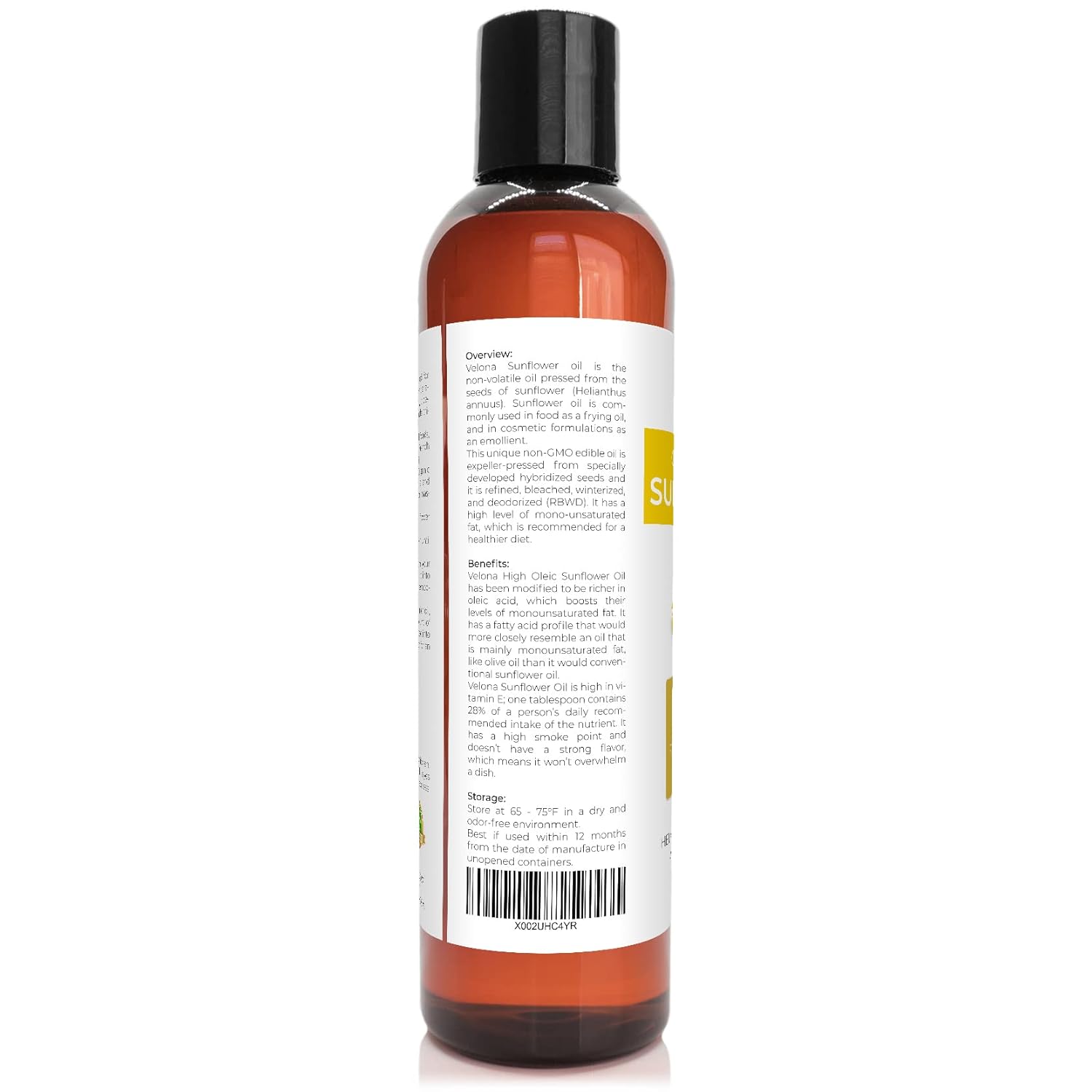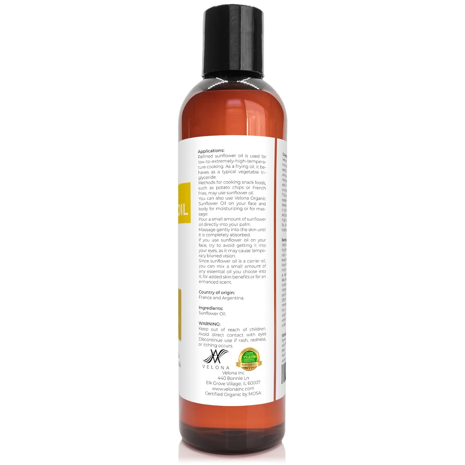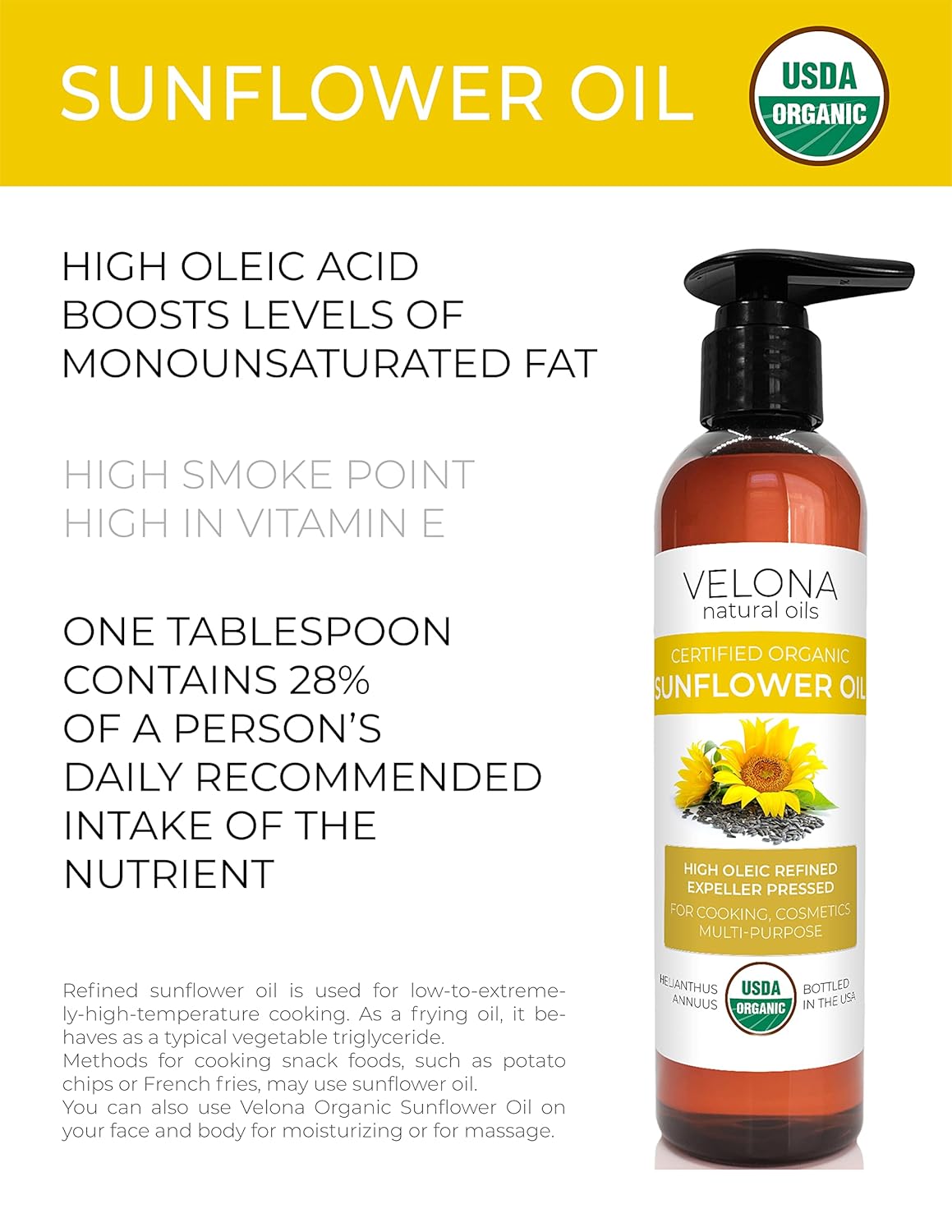 velona USDA Certified Organic Sunflower Oil - 8 oz | 100% Pure and Natural Carrier Oil | High Oleic, Refined, Cold Pressed | Cooking, Skin, Hair, Body & Face Moisturizing