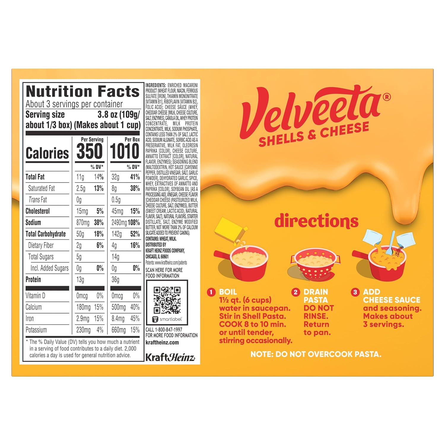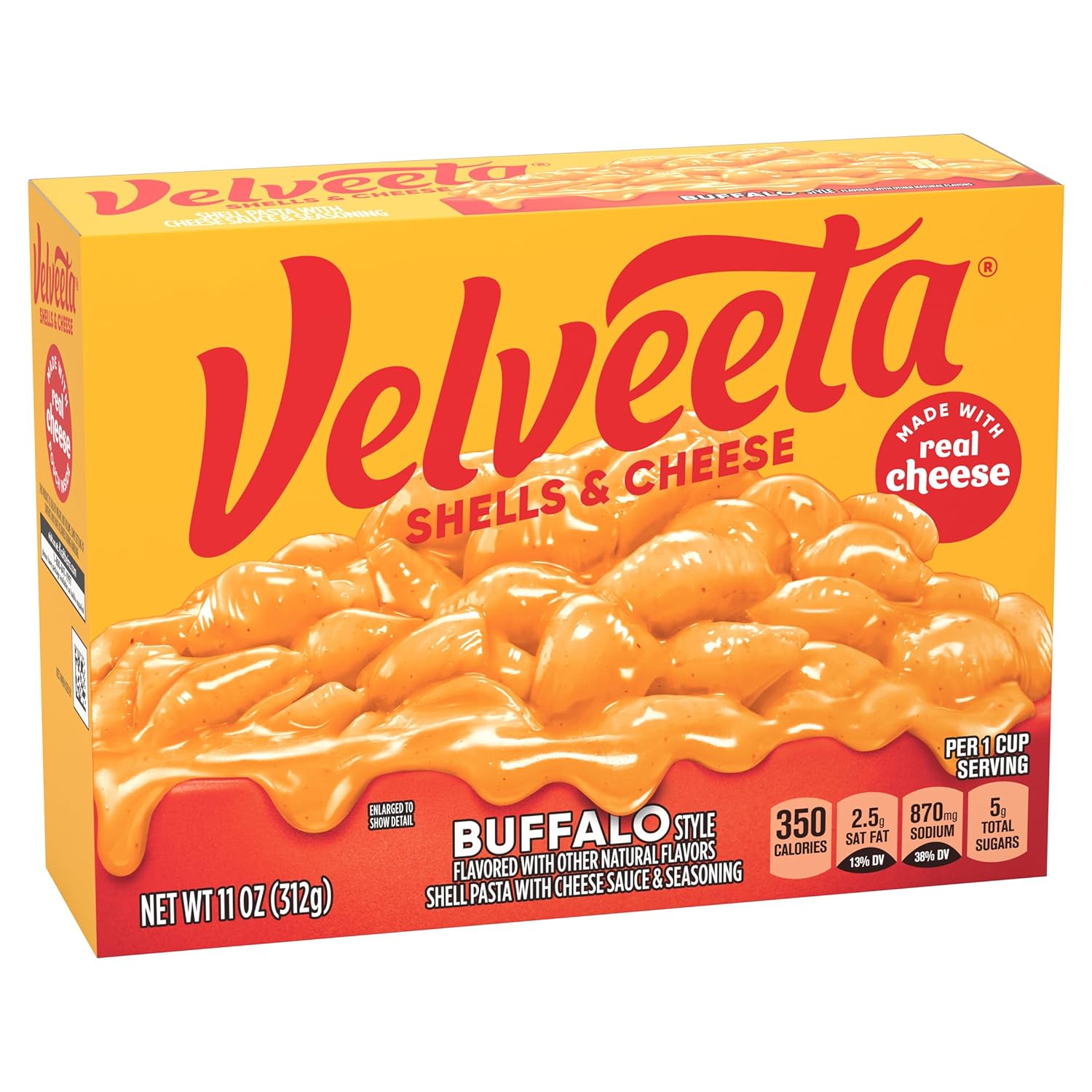 One 11 oz box of Velveeta Buffalo Style Shells & Cheese with Shell Pasta, Cheese Sauce and Seasoning10Overall liking was higher than original10Purchase intent amongst blind consumers was higher than original10No branded competition has these flavors10Contains shell pasta, cheese sauce and seasoning10Dive into the creamiest delight with Velveeta Buffalo Shells & Cheese. When your drip is as smooth as ours, there's no time to waste for delicious indulgence. Our recipe nails it with its iconic, velvety meltability and tender pasta shells that grip the drip like no other. Crafted with real cheese, Velveeta's supremely creamy texture and rich, savory taste fulfill your cravings any day of the week. Sometimes, the unnecessary is necessary, so sit back, relax and savor the flavor, whether as a snack, side dish or main course. Luxuriously convenient, preparing Velveeta Buffalo Shells & Cheese is a breeze. Simply boil the shell pasta on your stovetop according to the instructions, drain, mix with the included packet of velvety cheese sauce and seasoning, and indulge without regrets. That's the cheesy Buffalo bliss of Velveeta!