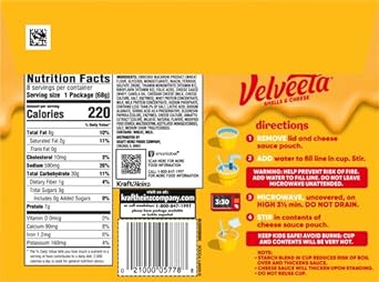 VELVEETA SHELLS & CHEESE: 8 ct box of Velveeta Shells & Cheese Original Microwaveable Shell Pasta & Cheese Sauce, 2.39 oz per cup10CREAMY TEXTURE: Velveeta melts the creamiest10CALM YOUR CRAVINGS: Satisfy your cravings with unrestrained pleasure10CHEESY & MELTY: Unapologetically go all-in for the cheesy, melty goodness you love best10INSTANT CHEESY GRATIFICATION: An outrageously delicious taste experience10Shell yeah! Live life to the creamiest with Velveeta Shells & Cheese Original Microwaveable Pasta Cup. When your drip is as smooth as ours, you donāt waste time when it comes to delicious indulgence. For instant cheesy gratification, our original recipe hits the mark, with iconic, velvety meltability and tender pasta shells that grip the drip like no other. Velveetaās supremely creamy texture and rich, savory taste satisfy your cravings any day of the week. Amp things up by customizing our cheesy pasta with added veggies, meat, toppings or seasonings. Sometimes unnecessary is necessary, so kick back, relax and embrace the flavor. Whether itās in the form of a snack, side dish or entree, preparing our luxuriously convenient single-serve Velveeta Shells and Cheese cup is a breeze. Simply remove lid and sauce pouch, add water up to the fill line, microwave uncovered for 3-1/2 minutes, stir in the liquid gold cheese sauce and enjoy, unapologetically. Each box contains eight 2.39 oz cups. Thatās La Dolce Velveeta!