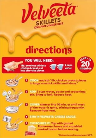 VELVEETA SKILLETS: One 12.5 oz box of Velveeta Skillets Chicken Alfredo Dinner Kit with creamy cheese sauce, pasta and seasonings10CREAMY TEXTURE: Velveeta melts the creamiest10CALM YOUR CRAVINGS: Satisfy your cravings with unrestrained pleasure10CHEESY & MELTY: Unapologetically go all-in for the cheesy, melty goodness you love best10INSTANT CHEESY GRATIFICATION: An outrageously delicious taste experience10Mac and relax! Live life to the creamiest with Velveeta Skillets Chicken Alfredo One Pan Dinner Kit. When your drip is as smooth as ours, you donāt waste time when it comes to delicious indulgence. For instant cheesy gratification, our chicken alfredo pasta dish hits the mark, with iconic, velvety meltability and tender pasta noodles that grip the drip like no other. Velveetaās supremely creamy texture and rich, savory taste satisfy your cravings any day of the week. Ready in 20 minutes, our one pan meal kit includes an alfredo sauce packet, pasta and special seasonings ā just add chicken! Sometimes unnecessary is necessary, so kick back, relax and embrace the flavor. Whether itās in the form of a snack, side dish or entree, preparing our luxuriously convenient Velveeta chicken alfredo is a breeze. Simply cook 1 pound of boneless, skinless chicken breast pieces in a large skillet. Add 2 cups of water, pasta and seasoning, simmering for 8-10 minutes. Remove from heat, stir in the Velveeta alfredo sauce and enjoy, unapologetically. Makes approximately 5 servings and contains 9 grams of protein per serving. Thatās La Dolce Velveeta!