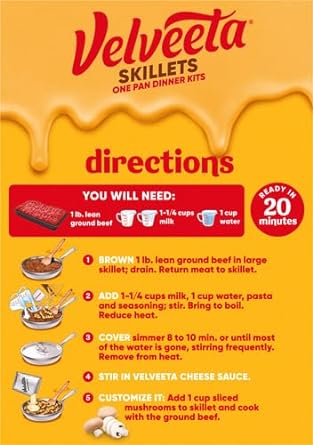 VELVEETA SKILLETS: One 11.6 oz box of Velveeta Skillets Creamy Beef Stroganoff Dinner Kit with cheese sauce, pasta and seasonings10CREAMY TEXTURE: Velveeta melts the creamiest10CALM YOUR CRAVINGS: Satisfy your cravings with unrestrained pleasure10CHEESY & MELTY: Unapologetically go all-in for the cheesy, melty goodness you love best10INSTANT CHEESY GRATIFICATION: An outrageously delicious taste experience10Viva la beef! Live life to the creamiest with Velveeta Skillets Beef Stroganoff One Pan Dinner Kit. When your drip is as smooth as ours, you don’t waste time when it comes to delicious indulgence. For instant cheesy gratification, our beef stroganoff dish hits the mark, with iconic, velvety meltability and tender pasta noodles that grip the drip like no other. Velveeta’s supremely creamy texture and rich, savory taste satisfy your cravings any day of the week. Ready in 20 minutes, our one pan meal kit includes a cheese sauce packet, pasta and special seasonings — just add ground beef! Sometimes unnecessary is necessary, so kick back, relax and embrace the flavor. Whether it’s in the form of a snack, side dish or entree, preparing our luxuriously convenient Velveeta beef stroganoff is a breeze. Simply brown 1 pound of lean ground beef in a large skillet. Drain and return it to the skillet along with 1-1/4 cups of milk, 1 cup of water, pasta and premium seasoning, simmering for 8-10 minutes. Remove from heat, stir in the Velveeta cheese sauce and enjoy, unapologetically. Makes approximately 5 servings and contains 9 grams of protein per serving. That’s La Dolce Velveeta!