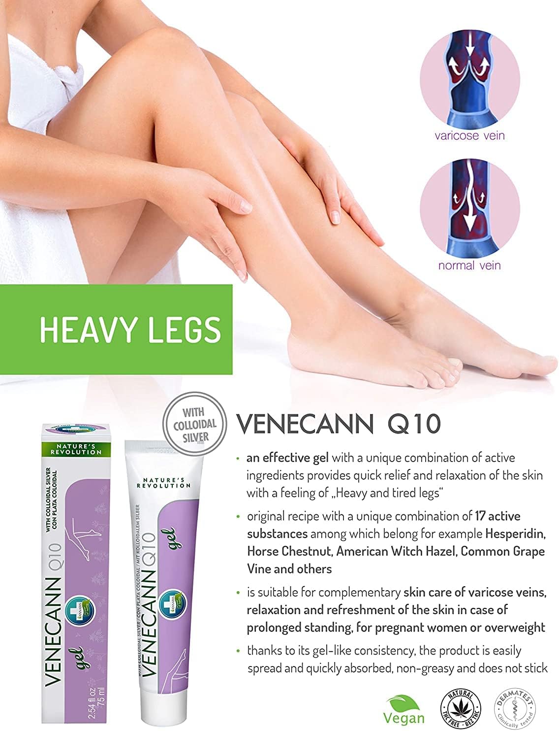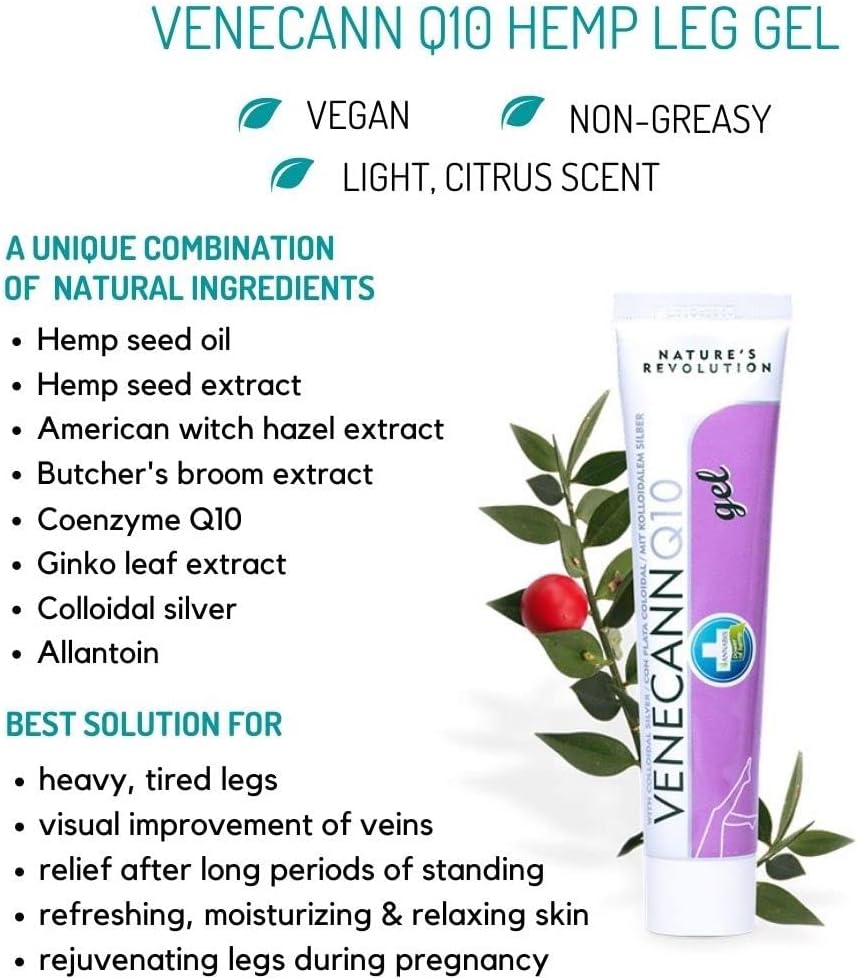 About this item RELIEF FOR TIRED LEGS – Use with massage for quick, refreshment of heavy legs, and tired legs to help get a good night’s sleep. soothes leg issues from excessive standing, sitting, and body weight. Has a mild, pleasant scent. VARICOSE VEINS GEL – Works as a varicose veins treatment to improve the Appearance of Varicose Veins and Spider Veins while providing gentle Refreshment to legs. Can also be used as a bruise cream to improve the visible appearance of bruises. VENECANN Q10 Gel can be applied repeatedly and massaged gently into the skin, ideally in the direction from ankles to knees throughout the day as needed. If varicose veins are present, rub the Gel lightly. The Gel formula spreads easier than tired legs cream and arnica cream and does not leave sticky or greasy residues like arnica oil or magnesium lotion. Natural - Vegan - Non-GMO - Cruelty-Free - Free of Paraben, Phthalate, Sulfates, Artificial Colors or Fragrances - Made in Europe Key Ingredients: Hemp Seed Oil - Hemp Seed Oil - Horse Chestnut Extract - American Witch Hazel Extract - Butcher’s Broom Extract - Common Grape Vine Extract - Centella Leaf Extract - Coenzyme Q10 - Ginkgo Leaf Extract - Allantoin See more product details,RELIEF FOR TIRED LEGS – Use with massage for quick, refreshment of heavy legs, and tired legs to help get a good night’s sleep. soothes leg issues from excessive standing, sitting, and body weight. Has a mild, pleasant scent,VARICOSE VEINS GEL – Works as a varicose veins treatment to improve the Appearance of Varicose Veins and Spider Veins while providing gentle Refreshment to legs. Can also be used as a bruise cream to improve the visible appearance of bruises,VENECANN Q10 Gel can be applied repeatedly and massaged gently into the skin, ideally in the direction from ankles to knees throughout the day as needed. If varicose veins are present, rub the Gel lightly. The Gel formula spreads easier than tired legs cream and arnica cream and does not leave sticky or greasy residues like arnica oil or magnesium lotion,Natural - Vegan - Non-GMO - Cruelty-Free - Free of Paraben, Phthalate, Sulfates, Artificial Colors or Fragrances - Made in Europe,Key Ingredients: Hemp Seed Oil - Hemp Seed Oil - Horse Chestnut Extract - American Witch Hazel Extract - Butcher’s Broom Extract - Common Grape Vine Extract - Centella Leaf Extract - Coenzyme Q10 - Ginkgo Leaf Extract - Allantoin