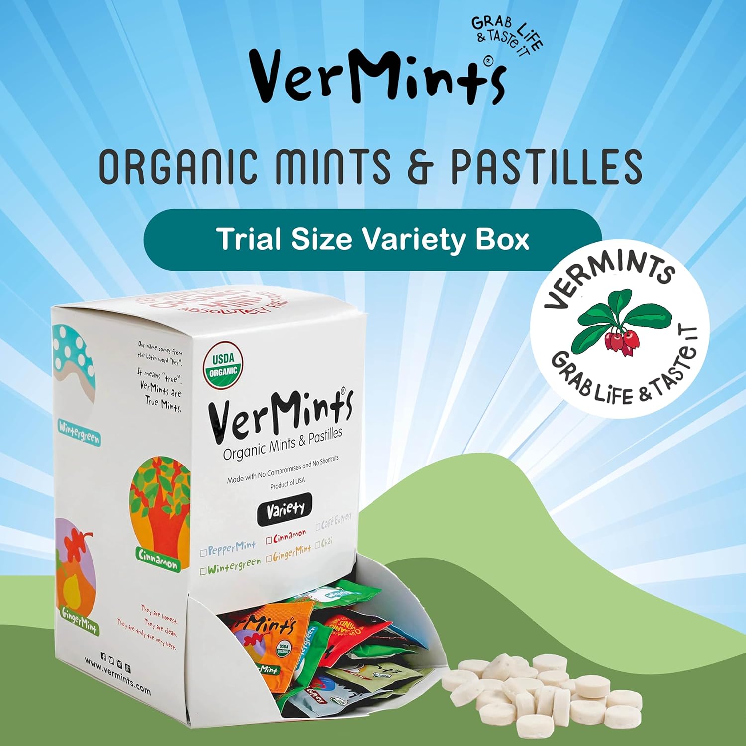 Vermints Organic Breath Mints β Travel Size Peppermints, Ginger Mints, Wintergreen, Cinnamon, Chai & Cafe Express Flavored Candy - Non-Gmo, Gluten-Free, Vegan & Kosher Healthy Refresh - 120 Count