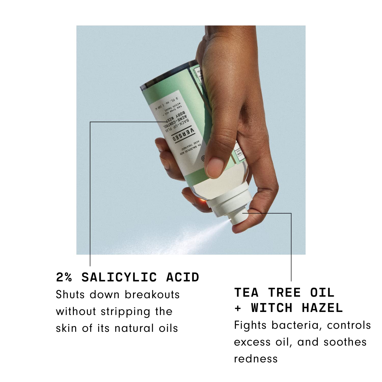 Versed Back-Up Acne Control Body Mist - All Over Blemish Spot Treatment + Salicylic Acid Spray with Tea Tree Oil & Witch Hazel - Oil Control + Redness Relief Acne Spray for Back & Body - Vegan (3 oz)