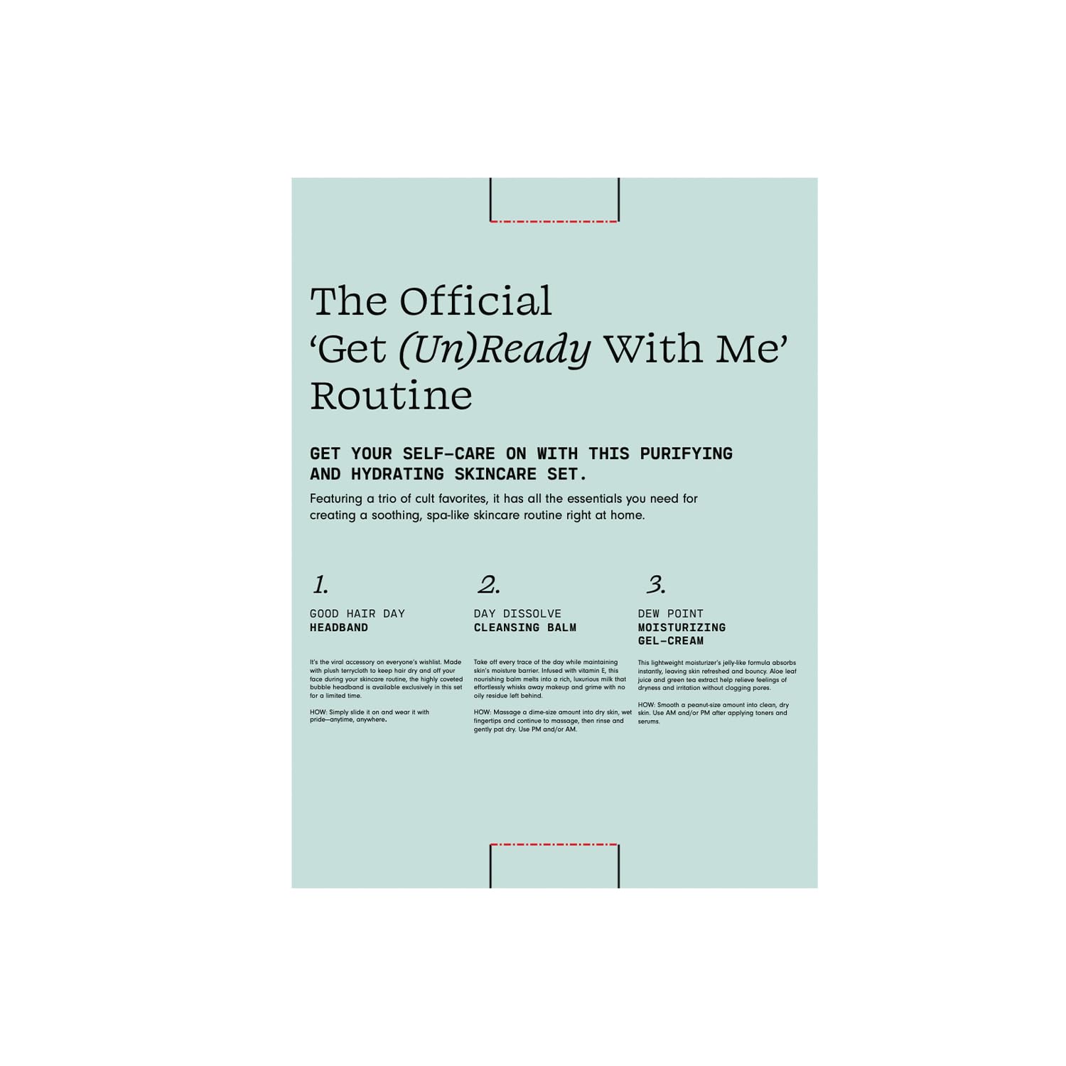 The Official ‘Get (Un)Ready With Me’ Routine. Get Your Self Care On With This Purifying And Hydrating Travel Skincare Kit. Featuring A Trio Of Cult Favorites, It Has All The Essentials You Need For Creating A Soothing, Spa-Like Skincare Routine At Home. Day Dissolve Cleansing Balm - Take Off Every Trace Of The Day While Maintaining Skin’S Moisture Barrier With This Cleansing Makeup Melting Balm. Infused With Avocado Oil, This Nourishing Balm Melts Into A Rich, Luxurious Milk That Effortlessly Whisks Away Makeup And Grime With No Oily Residue Left Behind. Good Hair Headband For Makeup, Skincare, & Cleansing - It’S The Viral Accessory On Everyone’S Wishlist. Made With Plush Terrycloth To Keep Hair Dry And Off Your Face During Your Skincare Routine, The Highly Coveted Bubble Headband Is Available Exclusively In This Stocking Stuffer Set For A Limited Time. Dew Point Moisturizing Gel Cream - This Lightweight Moisturizer Has A Jelly-Like Formula That Absorbs Instantly, Leaving Skin Refreshed And Bouncy. Aloe Leaf Juice And Green Tea Extract Help Relieve Feelings Of Dryness And Irritation Without Clogging Pores