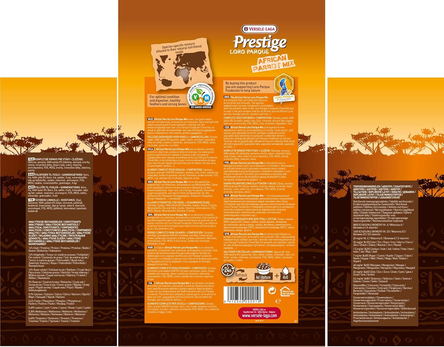 Product description Made using naturally occurring foods for African Parrots. This Loro Parque mix is made using quality seeds, cereals and nuts selected because of their presence in the natural food of African Parrots. As a result your African Parrot can really enjoy a quality diet tailored exactly for their preferred tastes. Composition Seeds, Cereals, Nuts, Vegetables, Derivatives of Vegetable Origin, Vegetable Protein Extracts, Minerals, Oils and Fats, Sugars, FOS, MOS. Analytical Constituents Protein - 14.00% Oil & Fats - 15.00% Crude Fibre - 14.00% Crude Ash - 5.00% Calcium - 0.90% Phosphorous - 0.40% Lysine - 0.40% Methionine - 0.30% Threonine - 0.40% Nutritional Additives per Kg Vitamin A - 8800 I.E. Vitamin D3 - 1600 I.E. Vitamin E - 20mg Iron - 20mg Iodine - 1.5mg Copper - 7mg Manganese - 45mg Zinc - 45mg Selenium - 0.2mg Contains: Colourants, Preservatives, Antioxidants. Directions for use Provide freely, refresh regularly. Always supply fresh drinking water. Ingredients Seeds, Cereals, Nuts, Vegetables, Derivatives of Vegetable Origin, Vegetable Protein Extracts, Minerals, Oils and Fats, Sugars, FOS, MOS. P.when('A').execute(function(A) { A.on('a:expander:toggle_description:toggle:collapse', function(data) { window.scroll(0, data.expander.$expander[0].offsetTop-100); }); }); Directions Provide freely, refresh regularly. Always supply fresh drinking water. See more