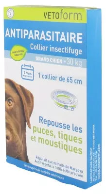 Vetoform Antiparasite Insect Repellent Collar Big Dog + 30Kgis A Margosa-Based Insect Repellent Collar That Repels Fleas, Ticks And Mosquitoes. It Does Not Deteriorate In Contact With Water Or Moisture And Does Not Disturb The Olfactory Sense Of Your Pet. Length: 65 Cm. Total Weight: 26 G