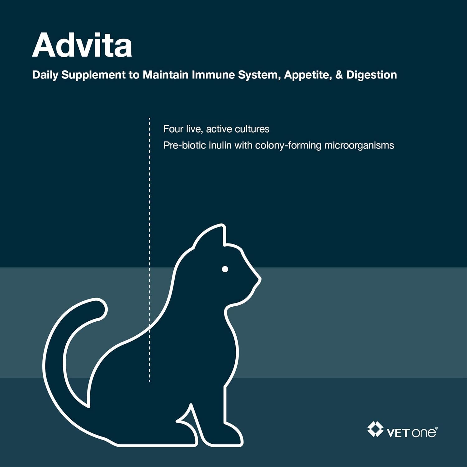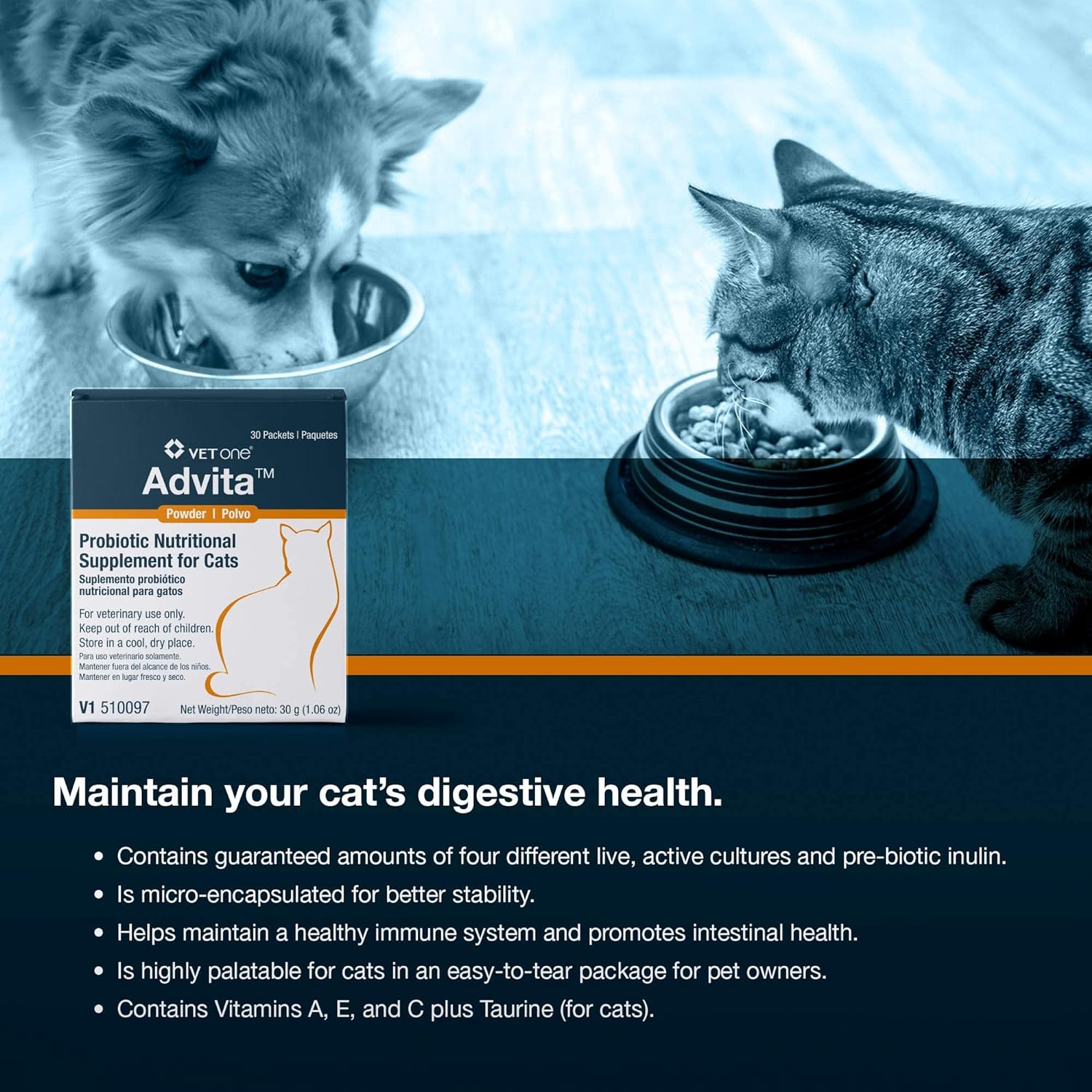 CHOOSING A PROBIOTIC FOR YOUR PET - Cat probiotics are used to boost the immune system, aid in digestion leading to improvements in their mood, fur & skin appearance, breath & overall health. Probiotics for cats may also be useful after surgery or if your pet is prone to digestive issues. With a guaranteed amount of four different live and active cultures as well as a prebiotic inulin to nourish and promote the growth of good bacteria, you will see a difference in how your pet feels and acts10GUARANTEED QUALITY - Inulin is a soluble fiber found in a wide variety of fruits, vegetables, and herbs. It is a prebiotic that feeds good bacteria to the gut, and nourish colon cells. This cat probiotic is used to help promote weight loss, relieve constipation, diarrhea, & help control diabetes. Inulin is not digested or absorbed in the stomach. Once consumed it then goes straight to the bowels where bacteria is able to use it for good. Advita is microencapsulated for better long term efficacy10HEALTHY IMMUNE SYSTEM - Advita is an encapsulated probiotic and won't activate until it reaches the GI Digestive System. Advita Probiotic Powder contains Vitamins A, E, and C. Vitamin A has been proven to support healthy eyes, including night vision, and skin health. Vitamin E supports the immune system and growth of red blood cells. Vitamin C is an important antioxidant for your pet. Use daily to help maintain your pet's appetite, digressional track, and healthy, shiny and soft coat10WHEN & HOW TO USE - Advita Probiotic is designed for daily use to maintain appetite, digestion, and normal stool consistency in dogs and puppies. Also, beneficial before and after veterinary procedures, during diet changes, and when boarding or traveling. Mix this fortiflora for cats powder packet in with their water bowl under the supervision of your veterinarian10EASY TO ADMINISTER - Advita Probiotic Powder won't disrupt the taste for your pet, giving them the benefits without noticing any change. Even the pickiest of dogs or cats can receive their probiotic on a regular and daily basis where they look forward to meal time. Simply mix the powder packet in with their food or favorite snack. For best results add Advita Probiotic daily to your pet's breakfast to start their day off right