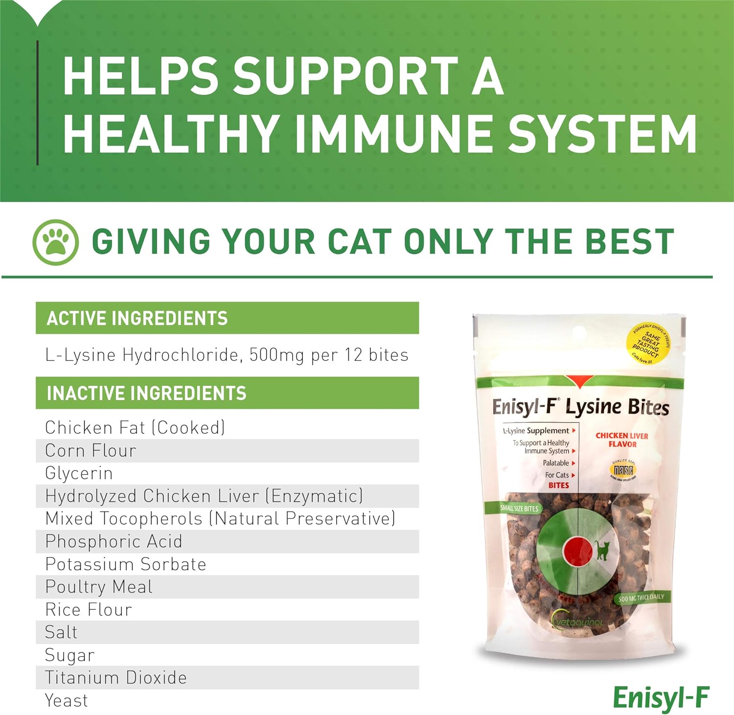 Daily L-Lysine supplement for cats helps support a strong immune system and eye & respiratory health10Helps manage common feline health issues: sneezing, runny nose, squinting and watery, inflamed eyes10Delivers veterinarian-recommended amount of Lysine: cats = 500mg 2x daily, kittens = 250mg 2x daily10Lysine bites for cats and kittens provides specially-formulated immune support for as long as needed10Cats love the highly-palatable chicken liver flavor chews; easy to dose and administer; portable