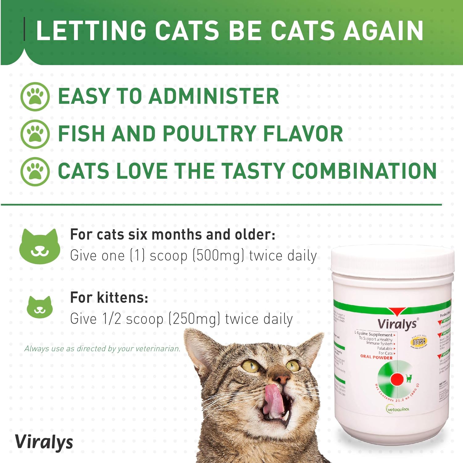 Daily L-Lysine supplement for cats helps support a strong immune system and eye & respiratory health10Helps manage common feline health issues such as sneezing, runny nose and watery, inflamed eyes10Lysine powder for cats & kittens provides specially-formulated immune support for as long as needed10Cats love the highly-palatable fish and poultry flavor; simple to dose and easy to administer10Delivers veterinarian-recommended amount of Lysine: cats = 500mg 2x daily, kittens = 250mg 2x daily