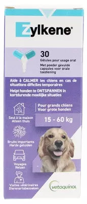 Vetoquinol Zylkene 450Mg 30 Capsules Is A Complementary Feed For Dogs Between 15 And 60 Kg When Faced With An Unusual Situation Or Before Situations Such As Changing The Environment, Staying Alone, New People, A New Companion, A Lactation Period, Weaning, Travelling, Fireworks Or Any Other Change In The Animal?S Habits