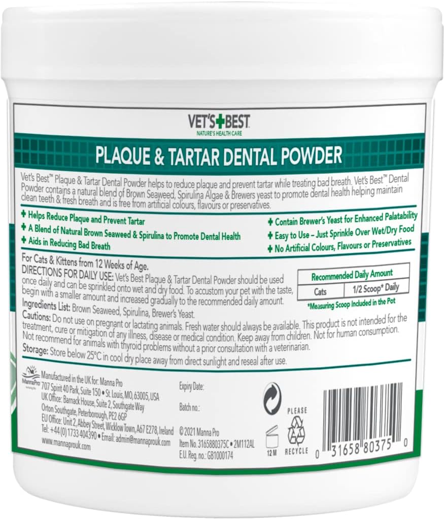 NATURAL INGREDIENTS Vet's Best dental powder for cats contains a natural blend of brown seaweed and spirulina algae