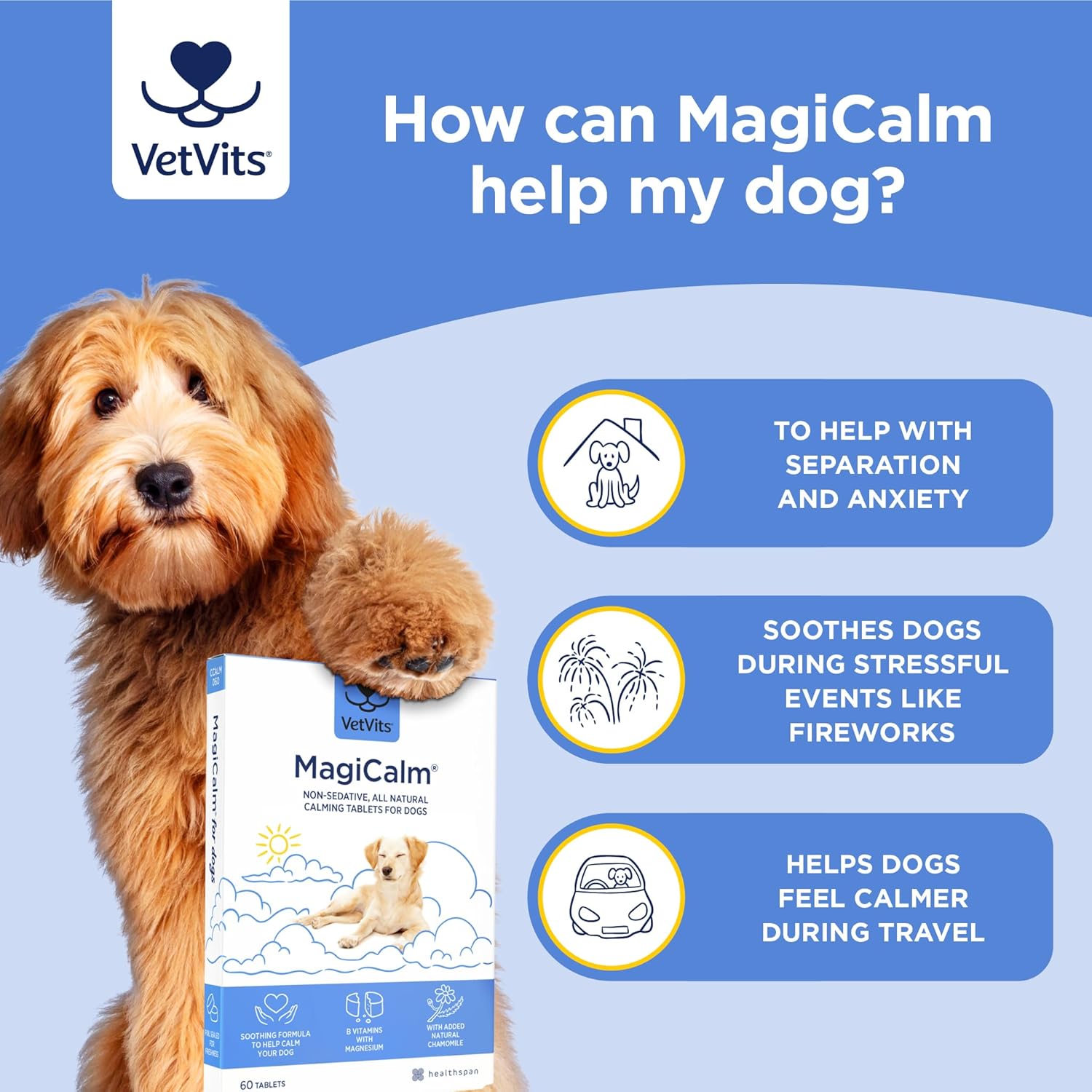 Vetvits By Healthspan Magicalm For Dogs (60 Tablets) | For Naturally Calmer & Less Anxious Dogs | Gentle, Soothing Formulation | Magnesium, Chamomile & B Vitamins | Tasty Beef Flavoured (60 Tablets)