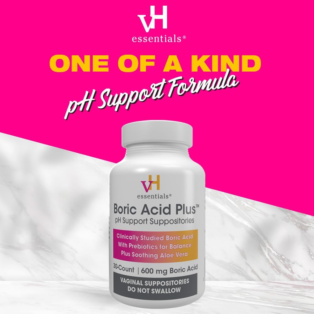 Vh Essentials Boric Acid Plus Vaginal Suppositories, Prebiotic Infused With Soothing Aloe Vera, Ph Support Formula Fights Odor And Promotes Freshness, 600Mg Boric Acid, 30 Count