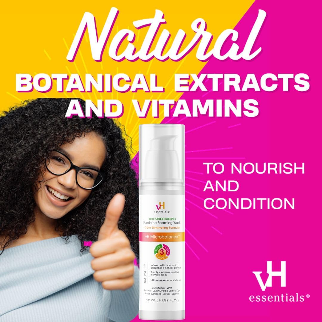 About this item Triple-Action Formula for Odor Defense: This foaming wash combines boric acid, prebiotics, and natural extracts to maintain a balanced pH while eliminating unwanted odors. Designed for daily use, it keeps you feeling fresh and confident all day long Infused with Skin-Nourishing Ingredients: Enriched with lavender, chamomile, & cranberry fruit extracts, this gentle formula helps nourish your skin while providing effective cleansing Gentle Cleansing for Intimate & All-Over Use: Not only is this specifically formulated for sensitive intimate areas, this wash is safe to use on your entire body, offering versatile all-in-one vH Microbalance: by keeping your pH balanced, you support your body's natural defenses, reduce irritation, and promote overall comfort and health Free from Harsh Chemicals: Crafted with no parabens, sulfates, artificial colors, dyes, gluten, betaines, or animal byproducts, this wash provides a clean and safe experience for sensitive skin, ensuring peace of mind with every use › See more product details,Triple-Action Formula for Odor Defense: This foaming wash combines boric acid, prebiotics, and natural extracts to maintain a balanced pH while eliminating unwanted odors. Designed for daily use, it keeps you feeling fresh and confident all day long,Infused with Skin-Nourishing Ingredients: Enriched with lavender, chamomile, & cranberry fruit extracts, this gentle formula helps nourish your skin while providing effective cleansing,Gentle Cleansing for Intimate & All-Over Use: Not only is this specifically formulated for sensitive intimate areas, this wash is safe to use on your entire body, offering versatile all-in-one,vH Microbalance: by keeping your pH balanced, you support your body's natural defenses, reduce irritation, and promote overall comfort and health,Free from Harsh Chemicals: Crafted with no parabens, sulfates, artificial colors, dyes, gluten, betaines, or animal byproducts, this wash provides a clean and safe experience for sensitive skin, ensuring peace of mind with every use