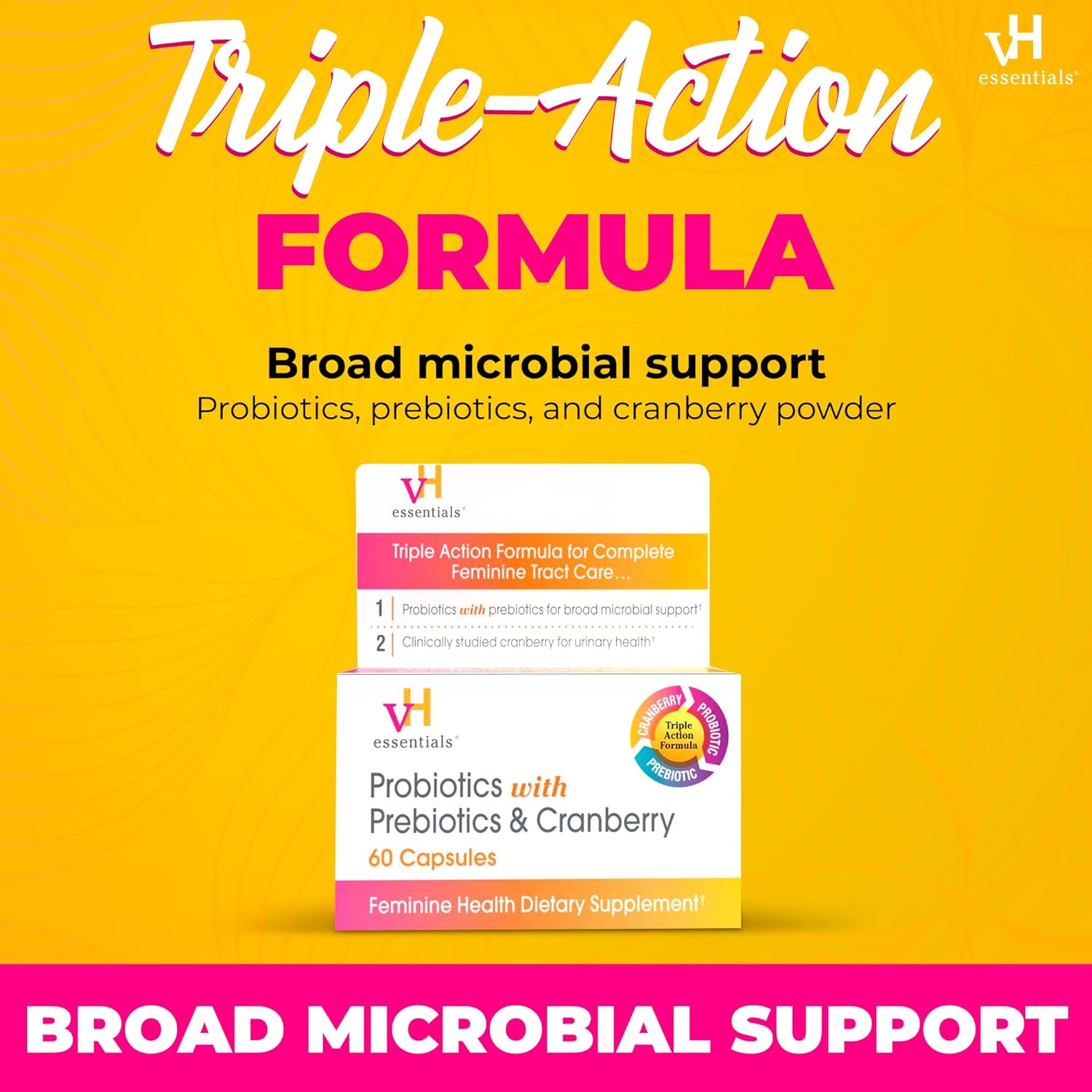 About this item Essential ingredients for complete feminine care: This triple-action supplement combines prebiotics and probiotics, cranberry powder and vitamin c to support vaginal health, urinary tract health, and gut health for women* Science-backed prebiotics and probiotics for women: Help restore and maintain vaginal flora with powerful vaginal pre and probiotics that deliver broad microbial support, promoting pH balance, comfort and harmony throughout the feminine tract* Clinically proven cranberry extract: Unlike basic cranberry pills, our cranberry supplement features PACRAN, a clinically proven natural cranberry extract shown to support urinary tract cleansing – plus added vitamin c for enhanced protection* Simple daily routine: Swap the handfuls of individual supplements for the all-in-one formula packed with essential ingredients shown to support vaginal health, gut health and urinary tract health for women – just take 2 capsules per day No-nonsense supplements for women: At vH Essentials, we blend science and nature to create accessible, yet effective feminine health products—from menstruation to menopause—crafted with input from women’s health experts › See more product details,Essential ingredients for complete feminine care: This triple-action supplement combines prebiotics and probiotics, cranberry powder and vitamin c to support vaginal health, urinary tract health, and gut health for women,Science-backed prebiotics and probiotics for women: Help restore and maintain vaginal flora with powerful vaginal pre and probiotics that deliver broad microbial support, promoting pH balance, comfort and harmony throughout the feminine tract,Clinically proven cranberry extract: Unlike basic cranberry pills, our cranberry supplement features PACRAN, a clinically proven natural cranberry extract shown to support urinary tract cleansing – plus added vitamin c for enhanced protection,Simple daily routine: Swap the handfuls of individual supplements for the all-in-one formula packed with essential ingredients shown to support vaginal health, gut health and urinary tract health for women – just take 2 capsules per day,No-nonsense supplements for women: At vH Essentials, we blend science and nature to create accessible, yet effective feminine health products—from menstruation to menopause—crafted with input from women’s health experts