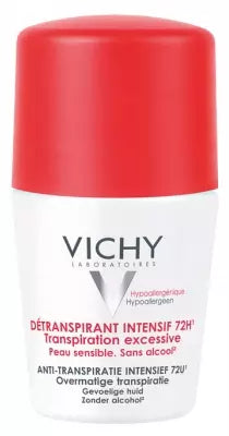 Vichy Intensive Detranspirant 72H Roll-On Deodorant Is An Intensive Antiperspirant Treatment, Indicated In Case Of Excessive Perspiration. It Regulates Perspiration During 72 Hours, Even In Conditions Of Stress. It Reduces Sudoral Hyperactivity And Absorbs The Excess Of Dampness While Protecting Skin. The Skin, Even Sensitive, Breathes And It Is Protected From Irritations. Quick Drying And Fresh Texture, Non Sticky. Ethanol-Free, Alcohol-Free, Paraben-Free
