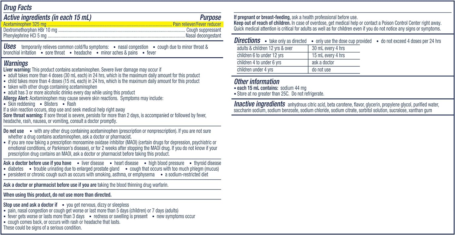 MULTI-SYMPTOM COLD RELIEF FROM COUGH, SORE THROAT AND FEVER: Provides fast relief of aches, fever, sore throat, cough, and stuffy nose. Effective for up to 4 hoursSIMPLE, EFFECTIVE RELIEF: Specially formulated to be free of artificial dyes and flavors, high fructose corn syrup, and alcoholDESIGNED FOR CHILDREN: Vicks Children's Multi-Symptom Cold Relief is designed to have a great-tasting, citrus flavor your child will lovePAIN RELIEVER, FEVER REDUCER, COUGH SUPPRESSANT AND DECONGESTANT: Contains Acetaminophen, Dextromethorphan HBr, and Phenylephrine HCIFORMULATED FOR CHILDREN AGES 6+Vicks Children's Multi-Symptom Cold medicine will treat your child's aches, fever, sore throat, cough, and stuffy nose, and is suitable for children ages 6+. Formulated for children ages 6+ and designed for parents who want to give the best to their children, while avoiding artificial dyes and flavors, high fructose corn syrup, and alcohol. Vicks Children's Multi-Symptom Cold medicine contains proven ingredients to tackle your child's cold and cough symptoms, and is free of artificial dyes and flavors, high fructose corn syrup, and alcohol. Offering simple, effective relief, Vicks Children's Multi-Symptom Cold medicine relieves your child's symptoms so they, and the whole family, can go on with their day. It is specially formulated for kids with a great tasting citrus flavor. Vicks has been trusted by parents to treat their children's cough, cold and flu symptoms for over 125 years