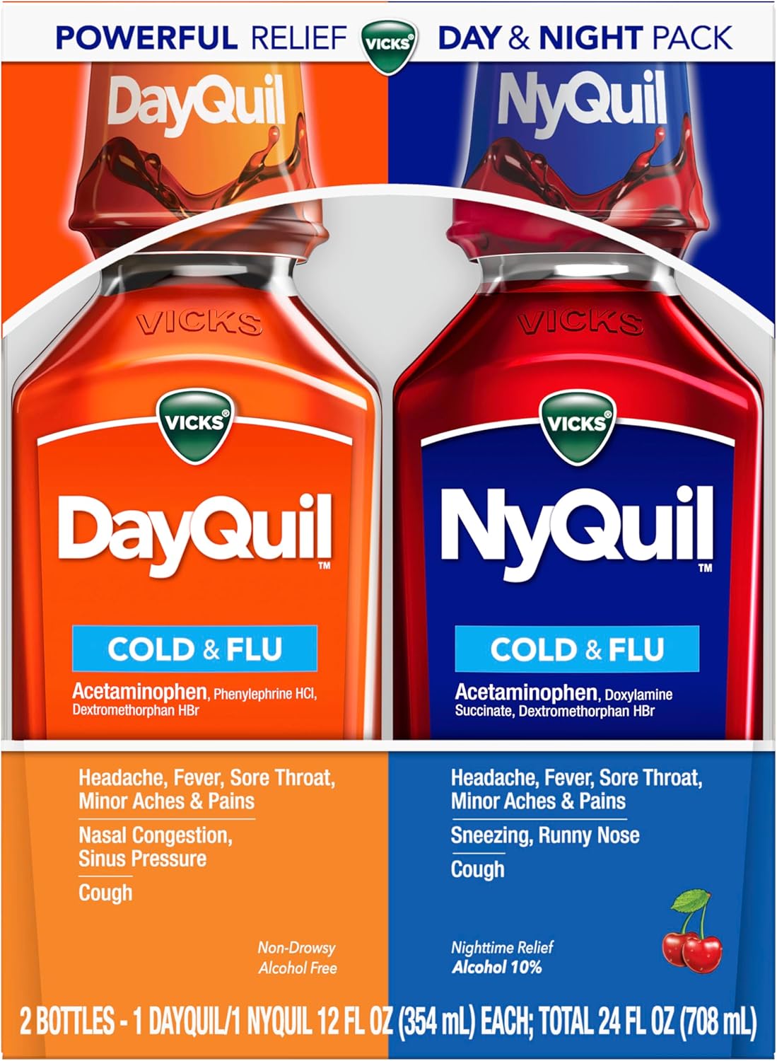 Vicks Dayquil And Nyquil Cherry Cold And Flu Relief Cherry-Flavored Liquid Medicine, Cherry Flavored, Combo Pack, 2 X 12 Fl Oz Bottles