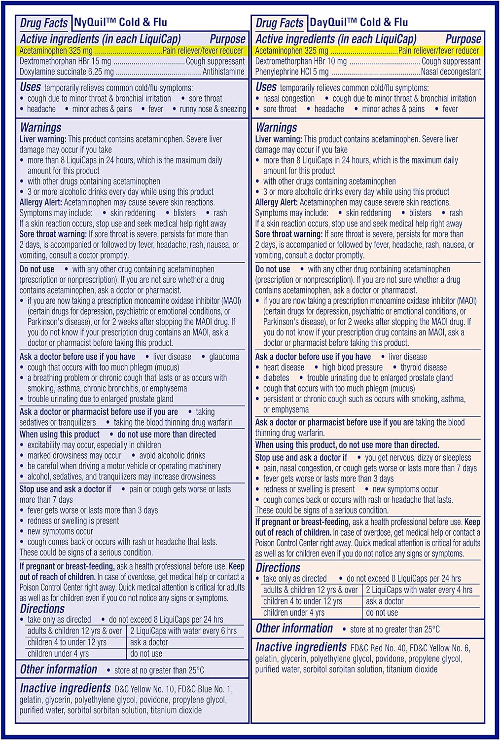 From The World'S #1 Selling Otc Cough And Cold Brand**, Vicks Dayquil And Nyquil Liquicaps Provide Fast, Powerful Relief For Your Worst Cold And Flu Symptoms. With This Dayquil And Nyquil Liquid Combo Pack, You'Ll Have The Cold And Flu Multi-Symptom Relief You Need On Hand, Day And Night.When You Have A Cold And Need To Get A Good Night'S Sleep, Nyquil Nighttime Medicine Will Temporarily Relieve Headaches, Fever, Sore Throat, Minor Aches And Pains, Sneezing, Runny Nose, And Cough. For Powerful, Non-Drowsy Daytime Relief So You Can Get On With Your Day, Try Vicks Dayquil Cold & Flu - It Temporarily Relieves Headache, Fever, Sore Throat, Minor Aches And Pains, Nasal Congestion, Sinus Pressure, And Cough. Vicks Has Been Trusted For Over 125 Years To Relieve Your Cold And Flu Symptoms. When You Need Fast, Powerful Cold And Flu Relief, Turn To Vicks Dayquil And Nyquil. Dayquil And Nyquil Are The #1 Pharmacist Recommended Daytime And Nighttime Cough, Cold & Flu Brands* *2022 Pharmacy Times Survey Of Pharmacists Otc Recommendations ** Nicholas Hall’S Global Chc Sales Database, Db22