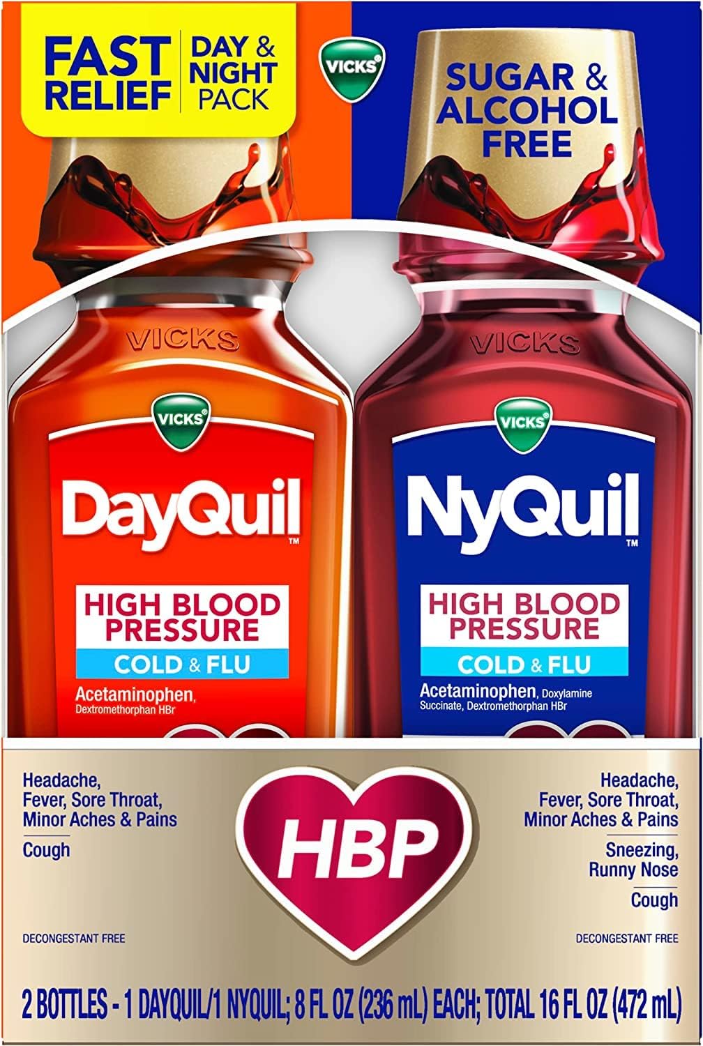 SPECIALLY FORMULATED COLD & FLU RELIEF FOR PEOPLE WITH HIGH BLOOD PRESSURE. High blood pressure means some medicines are off limits. Not this one! Specially formulated to be decongestant, sugar, and alcohol freeFAST, POWERFUL MULTI-SYMPTOM RELIEF: NyQuil High Blood Pressure relieves headache, fever, sore throat, minor aches and pains, sneezing, runny nose, and coughEFFECTIVE COLD & FLU SYMPTOM RELIEF: DayQuil and NyQuil Cold & Flu medicine temporarily relieve common cold & flu symptoms. Just one dose starts working fast to provide effective cold & flu reliefPOWER THROUGH YOUR WORST COLD & FLU SYMPTOMS: Life doesn’t stop when you have a cold. DayQuil and NyQuil relieve bothersome symptoms, such as cough and fever, day and nightWORLD'S #1 SELLING OTC COUGH AND COLD BRAND** Vicks has been trusted for over 125 years to relieve your worst cold & flu symptomsFrom the world's #1 selling OTC cough and cold brand**, Vicks DayQuil and NyQuil High Blood Pressure liquid medicines are over-the-counter medications specially formulated for people with high blood pressure. High blood pressure means some medicines are off limits. Not these. With this DayQuil and NyQuil Liquid combo pack, you'll have the cold and flu multi-symptom relief you need on hand, day and night. If you have High Blood Pressure, DayQuil and NyQuil High Blood Pressure medicine provides fast, powerful relief for your worst cold & flu symptoms. They are sugar free and alcohol free. DayQuil and NyQuil High Blood Pressure are also decongestant free, unlike some ordinary cold medicines. When you have a cold and need to get a good night's sleep, NyQuil High Blood Pressure nighttime medicine will temporarily relieve headaches, fever, sore throat, minor aches and pains, sneezing, runny nose, and cough. For powerful, non-drowsy daytime relief so you can get on with your day, try Vicks DayQuil High Blood Pressure Cold & Flu - it temporarily relieves headache, fever, minor aches and pains, sore throat, and cough. Vicks has been trusted for over 125 years to relieve your cold and flu symptoms. When you need fast, powerful cold and flu relief, turn to Vicks DayQuil and Nyquil. DayQuil and NyQuil are the #1 pharmacist recommended daytime and nighttime cough, cold & flu brands* NyQuil: Active ingredients per 30 mL dose for adults are acetaminophen 650 mg (pain reliever/fever reducer), dextromethorphan HBr 30 mg (cough suppressant), and doxylamine succinate 12.5 mg (antihistamine). Store at room temperature; do not refrigerate. Take only as directed. Use only the dose cup provided. Do not exceed 4 doses per 24 hours. Adults and children 12 years and over take 30 mL every 6 hours. DayQuil: Active ingredients per 30 mL dose for adults are acetaminophen 650 mg (pain reliever/fever reducer) and dextromethorphan HBr 20 mg (cough suppressant). Store at room temperature; do not refrigerate. Take only as directed. Use only the dose cup provided. Do not exceed 4 doses per 24 hours. Adults and children 12 years and over take 30 mL every 4 hours. *2022 Pharmacy Times Survey of Pharmacists OTC Recommendations ** Nicholas Hall’s global CHC sales database, DB20