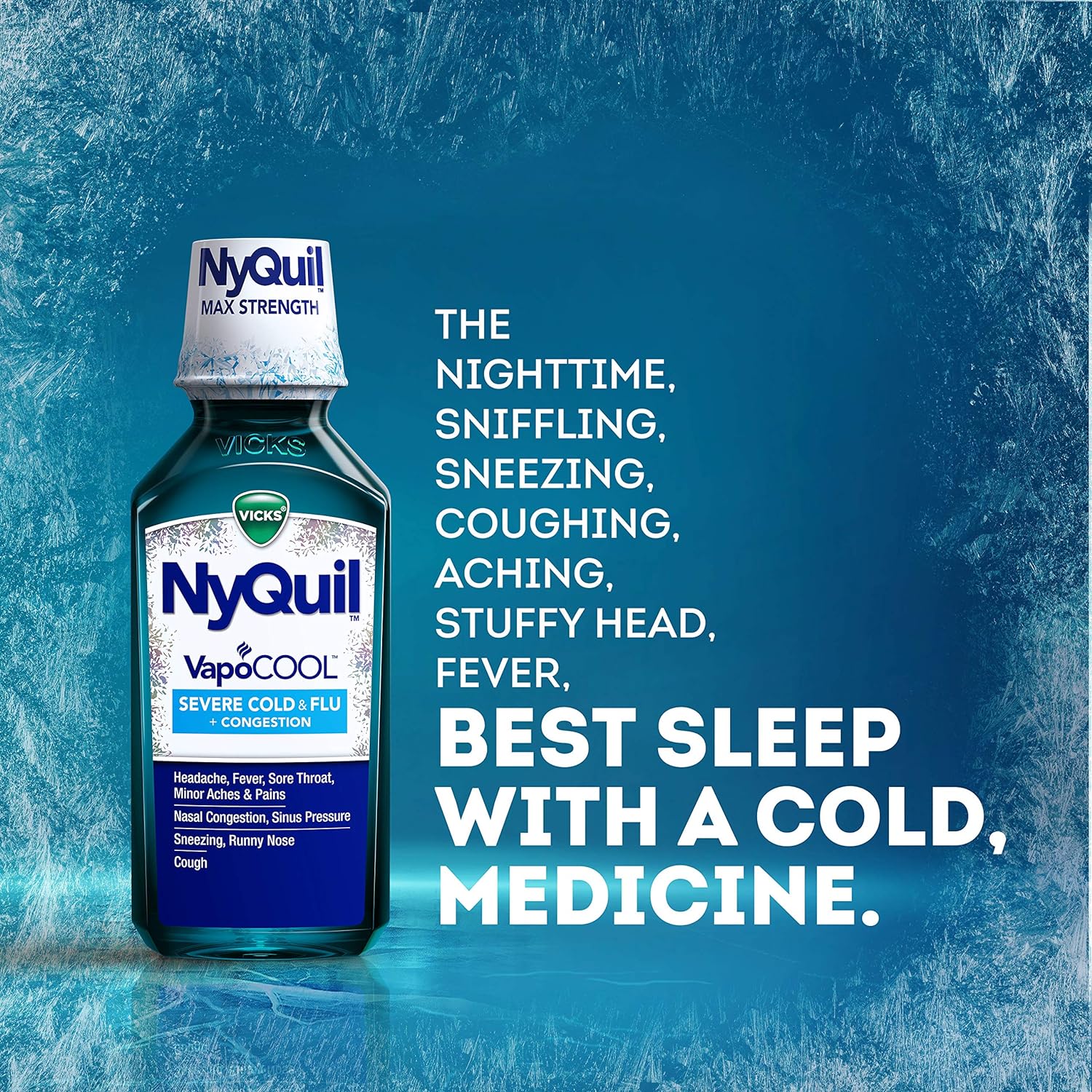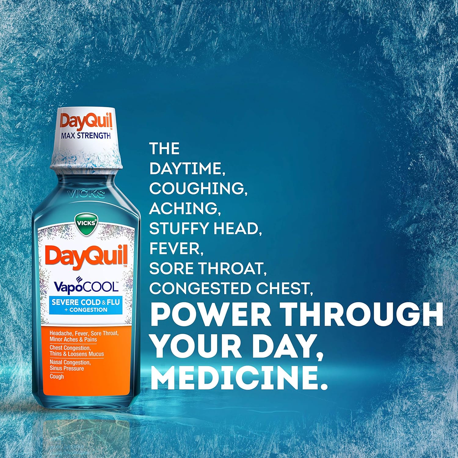 Vaporize Your Cold With Vicks Dayquil And Nyquil Vapocool Severe Cold & Flu + Congestion Liquid Medicine. Just One Dose Starts Working Fast To Relieve 9 Of Your Worst Cold And Flu Symptoms, To Help Take You From 9 To None. From The World'S #1 Selling Otc Cough And Cold Brand**, Vicks Dayquil And Nyquil Vapocool Severe Provide Fast, Powerful, Maximum Strength Relief. Experience A Powerful, Cooling Rush Of Vicks Vapors. Try Dayquil Vapocool Severe For Fast, Non-Drowsy Daytime Relief And Use Vicks Nyquil Vapocool Severe When You Need Maximum Strength, Nighttime Relief For Your Toughest Cold Symptoms So You Can Get The Rest You Need. Vicks Dayquil Severe Provides 9-Symptom Relief To Treat Coughing, Stuffy Nose, Minor Aches, Chest Congestion, Sinus Congestion, Sinus Pressure, Sore Throat, Headache, And Fever. Vicks Nyquil Severe Provides 9-Symptom Relief To Treat Coughing, Stuffy Nose, Minor Aches, Sneezing, Sinus Congestion, Sinus Pressure, Sore Throat, Headache, And Fever. Vicks Has Been Trusted For Over 125 Years To Relieve Your Cold And Flu Symptoms. Dayquil And Nyquil Are The #1 Pharmacist Recommended Daytime And Nighttime Cough, Cold & Flu Brands* *2022 Pharmacy Times Survey Of Pharmacists Otc Recommendations ** Nicholas HallāS Global Chc Sales Database, Db24
