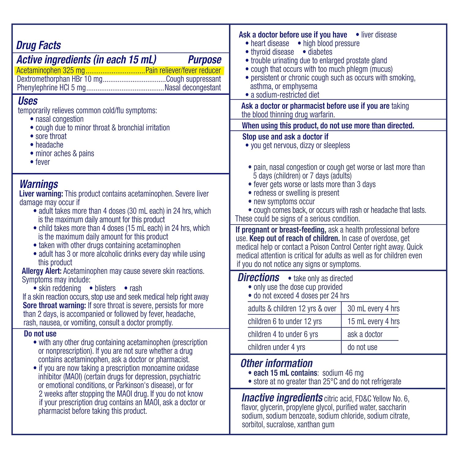 The Non-Drowsy, Coughing, Aching, Fever, Sore Throat, Stuffy Head, No Sick Days, Medicine Brought To You By Vicks, The World’S #1 Selling Cough And Cold Brand. The Non-Drowsy, Multi-Symptom Cold And Flu Relief Of Dayquil Cold & Flu Liquid Helps You Get Your Power Back, So You Can Enjoy The Day. Each Dose Contains Acetaminophen, A Pain Reliever/Fever Reducer Than Can Help Soothe Your Sore Throat. Adults And Children 12 Years And Over, Take 30 Ml Every 4 Hours. Children 6 To Under 12 Years, Take 15 Ml Every 4 Hours. Do Not Exceed 4 Doses Per 24 Hours. Take Only As Directed. Only Use The Dose Cup Provided