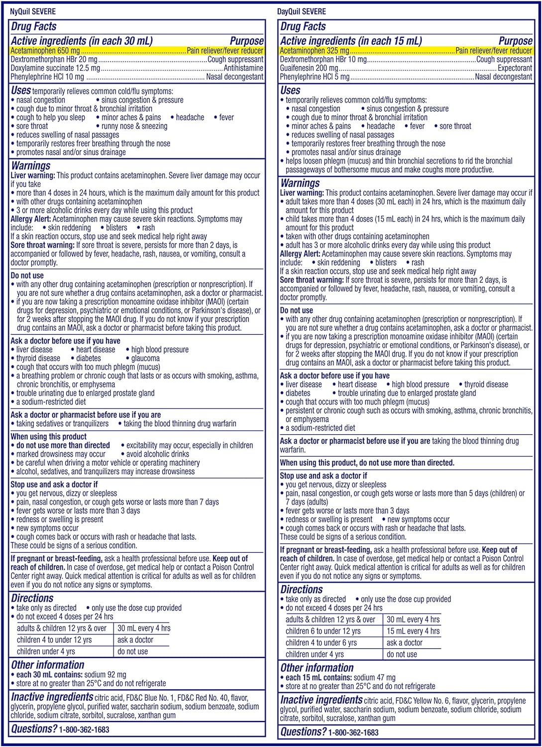 POWERFUL, MAXIMUM STRENGTH 9-SYMPTOM RELIEF: Use non-drowsy DayQuil SEVERE for daytime relief and at night try NyQuil SEVERE for fast relief so you can restPOWERFUL COLD & FLU RELIEF: DayQuil and NyQuil SEVERE temporarily relieve common cold & flu symptomsNOTHING WORKS FASTER: Just one dose starts working fast to provide effective cold & flu reliefPROVEN RELIEF FOR YOUR WORST COLD & FLU SYMPTOMS: Life doesn’t stop when you have a cold, NyQuil and DayQuil SEVERE tackle your most bothersome cold & flu symptoms taking you from 9 to noneWORLD'S #1 SELLING OTC COUGH AND COLD BRAND** Vicks has been trusted for over 125 years to relieve your worst cold & flu symptomsKnock your cold out with Vicks DayQuil and NyQuil SEVERE Cold & Flu Liquid medicine. Just one dose starts working fast to relieve 9 of your worst cold and flu symptoms, to help take you from 9 to none. From the world's #1 selling OTC cough and cold brand**, Vicks DayQuil and NyQuil SEVERE provide maximum strength relief for your cold and flu symptoms, day and night. Try Vicks DayQuil SEVERE for fast, non-drowsy daytime relief and use Vicks NyQuil SEVERE when you need maximum strength, nighttime relief for your toughest cold symptoms so you can get the rest you need. Vicks DayQuil SEVERE provides 9-symptom relief to treat coughing, stuffy nose, minor aches, chest congestion, sinus congestion, sinus pressure, sore throat, headache, and fever. Vicks NyQuil SEVERE provides 9-symptom relief to treat coughing, stuffy nose, minor aches, sneezing, sinus congestion, sinus pressure, sore throat, headache, and fever. Vicks has been trusted for over 125 years to relieve your cold and flu symptoms. Turn to Vicks DayQuil and Nyquil. DayQuil and NyQuil are the #1 pharmacist-recommended daytime and nighttime cough, cold & flu brands* *2022 Pharmacy Times Survey of Pharmacists OTC Recommendations ** Nicholas Hall’s global CHC sales database, DB21
