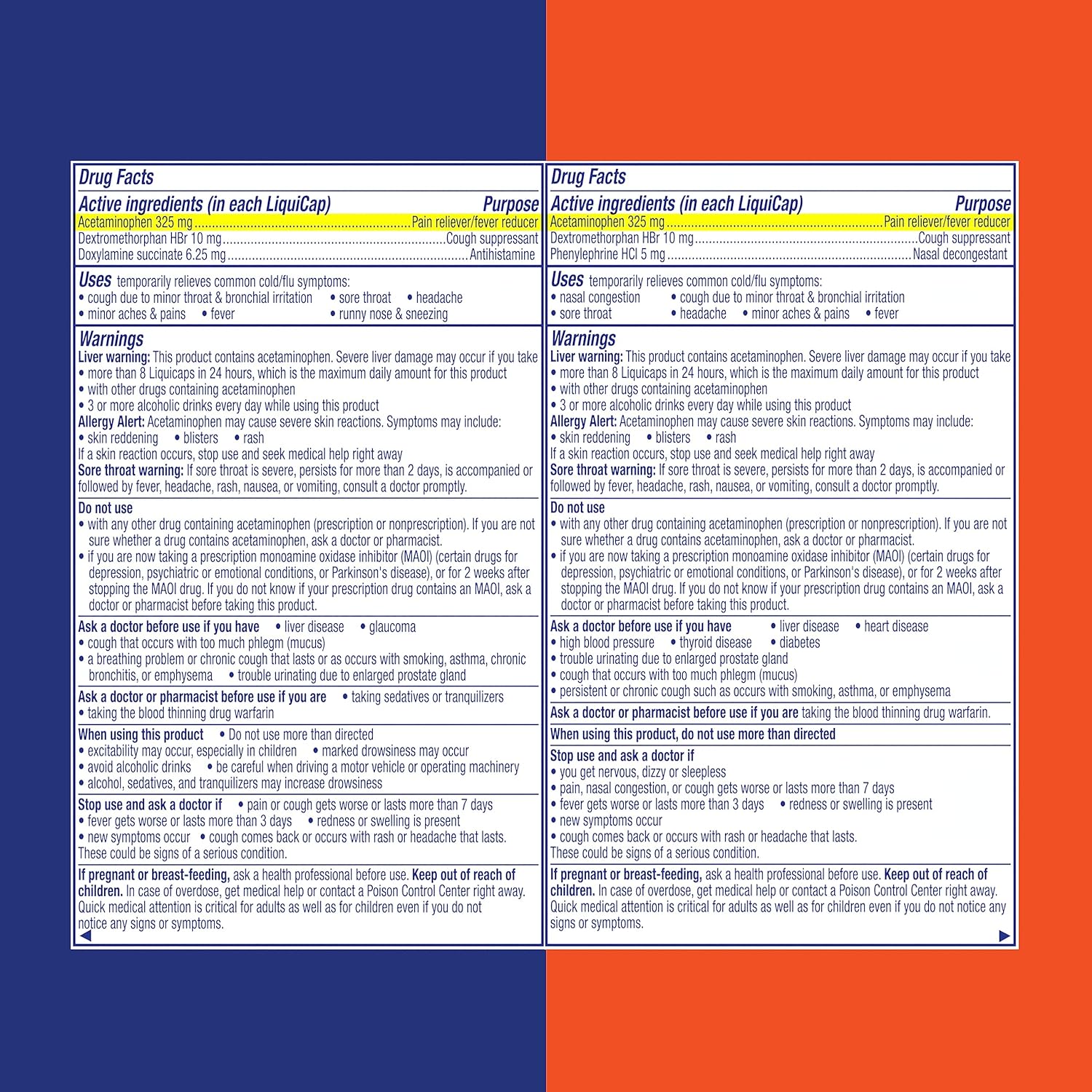 With The Dayquil And Nyquil Ultra Concentrated Co-Pack, You'Ll Have The Cold And Flu Multi-Symptom Relief You Need On Hand, Day Or Night. Vicks Dayquil Ultra Concentrated Cold & Flu Provides Powerful, Non-Drowsy, Daytime Relief For Your Worst Cold And Flu Symptoms. Dayquil Relieves Headache, Fever, Sore Throat, Minor Aches & Pains, Nasal Congestion, And Cough. Contains Acetaminophen. Now Available In 25% Smaller Liquicaps Compared To Original Dayquil Liquicaps. Now Available In An Easy To Open Bottle. Vicks Nyquil Ultra Concentrated Cold & Flu Provides Powerful, Nighttime Relief For Your Worst Cold And Flu Symptoms. Nyquil Relieves Headache, Fever, Sore Throat, Minor Aches & Pains, Nasal Congestion, And Cough. Contains Acetaminophen. Now Available In 25% Smaller Liquicaps Compared To Original Nyquil Liquicaps. Now Available In An Easy To Open Bottle.*Compared To Orginal Dayquil/Nyquil Liquicapscompared To Original Dayquil/Nyquil Blister Packs