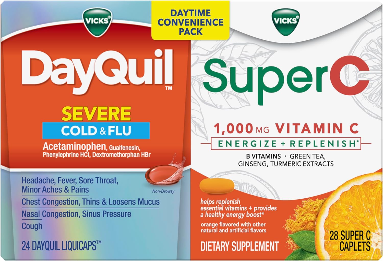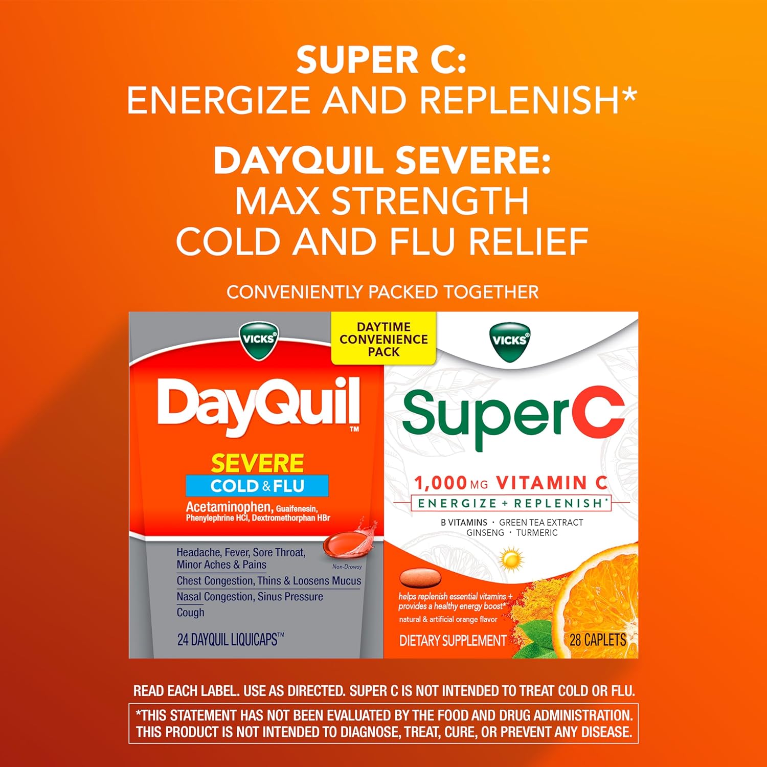 Vicks Dayquil Severe And Super C Convenience Pack Helps Make Your Life Simpler. Dayquil Severe Is The Daytime, Coughing, Aching, Stuffy Head, Fever, Congested Chest, Power Through Your Day, Medicine. Vicks Super C Is A Supplement To Help Energize And Replenish* Your Body With Vitamin C And B Vitamins Plus A Blend Of Quality Herbal Extracts Such As Ginseng, Green Tea, And Turmeric. *These Statements Have Not Been Evaluated By The Food And Drug Administration. This Product Is Not Intended To Diagnose, Treat, Cure, Or Prevent Any Disease. Super C Is Not Intended To Treat Cold Or Flu