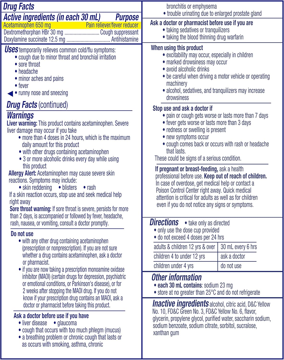 From The World'S #1 Selling Otc Cough And Cold Brand†, Vicks Nyquil Cold & Flu Liquid Provides Fast, Powerful Relief For Your Worst Cold And Flu Symptoms. When Cold Symptoms Keep You Up, Turn To Vicks Nyquil Cold & Flu Nighttime Relief Medicine To Help You Get The Rest You Need. When You Need Fast Relief, This Powerful, Multi-Symptom Relief Medicine Treats Headache, Fever, Sore Throat, Minor Aches And Pains, Sneezing, Runny Nose, And Cough Due To Minor Throat And Bronchial Irritation. Nothing Works Faster. Vicks Has Been Trusted For Over 125 Years To Relieve Your Cold And Flu Symptoms. Vicks Nyquil Is The #1 Pharmacist Recommended Nighttime Cough, Cold & Flu Brand* Active Ingredients Per 30 Ml Dose For Adults Are Acetaminophen 650 Mg (Pain Reliever/Fever Reducer), Dextromethorphan Hbr 30 Mg (Cough Suppressant), And Doxylamine Succinate 12.5 Mg (Antihistamine). Store At Room Temperature; Do Not Refrigerate. Take Only As Directed. Use Only The Dose Cup Provided. Do Not Exceed 4 Doses Per 24 Hours. Adults And Children 12 Years And Over Take 30 Ml Every 6 Hours. *2022 Pharmacy Times Survey Of Pharmacists Otc Recommendations † Nicholas Hall’S Global Chc Sales Database, Db20