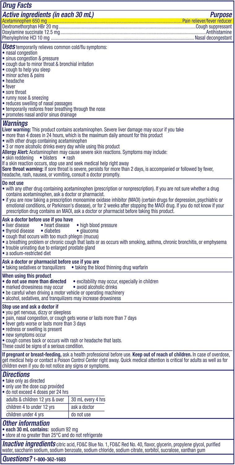 When Cold Symptoms Keep You Up, Try Vicks Nyquil Severe Cold & Flu Liquid Medicine. Just One Dose Starts Working Fast To Relieve 9 Cold And Flu Symptoms, To Help Take You From 9 To None. From The World'S #1 Selling Otc Cough And Cold Brand**, Vicks Nyquil Severe Provides Fast, Powerful, Maximum Strength Relief For Your Cold And Flu Symptoms. Vicks Nyquil Severe Provides Powerful, Maximum Strength 9-Symptom Relief To Treat Coughing, Sneezing, Stuffy Nose, Minor Body Pain, Sinus Congestion, Sinus Pressure, Sore Throat, Headache, And Fever. Vicks Has Been Trusted For Over 125 Years To Relieve Your Cold And Flu Symptoms. Nyquil Is The #1 Pharmacist-Recommended Nighttime Cough, Cold & Flu Brand* Active Ingredients Per 30 Ml Dose For Adults Are Acetaminophen 650 Mg (Pain Reliever/Fever Reducer), Dextromethorphan Hbr 20 Mg (Cough Suppressant), Doxylamine Succinate 12.5 Mg (Antihistamine), Phenylephrine Hci 10 Mg (Nasal Decongestant). Store At Room Temperature; Do Not Refrigerate. Take Only As Directed. Use Only The Dose Cup Provided. Do Not Exceed 4 Doses Per 24 Hours. Adults And Children 12 Years And Over Take 30 Ml Every 4 Hours. *2022 Pharmacy Times Survey Of Pharmacists Otc Recommendations ** Nicholas HallāS Global Chc Sales Database, Db20