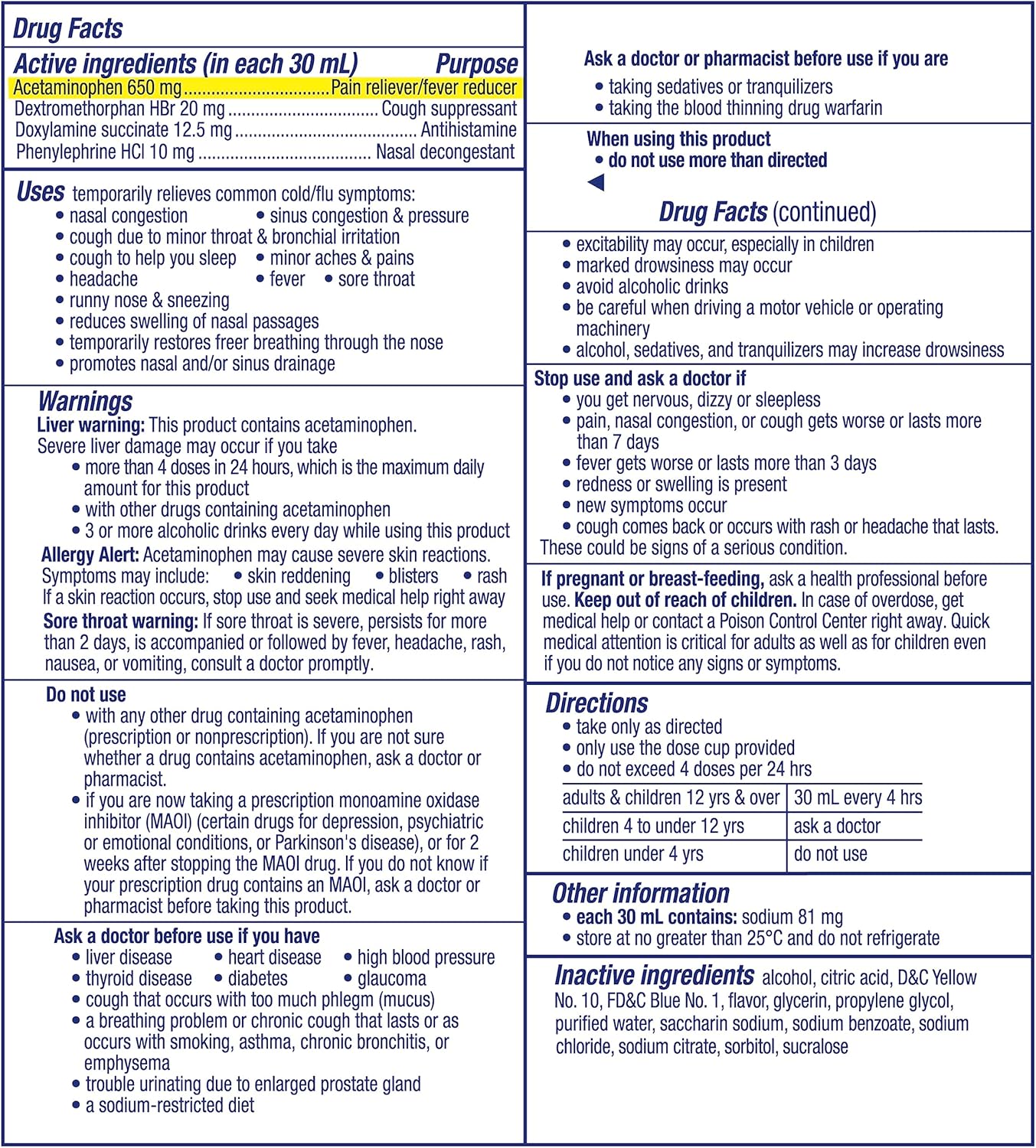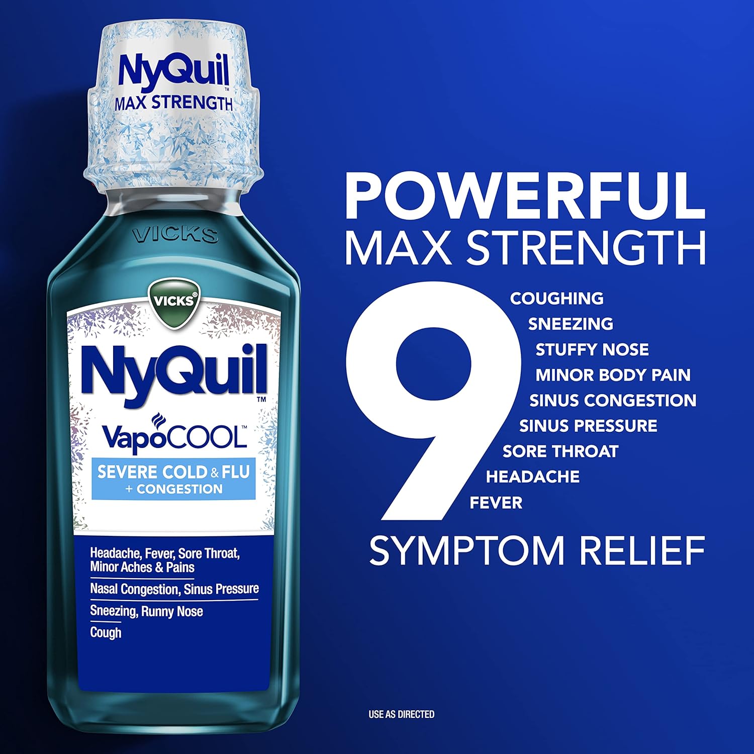 Vaporize Your Cold With Vicks Nyquil Vapocool Severe Cold & Flu + Congestion Liquid Medicine. Just One Dose Of This Over-The-Counter Medicine Starts Working Fast To Relieve 9 Of Your Worst Cold And Flu Symptoms, To Help Take You From 9 To None. From The World'S #1 Selling Otc Cough And Cold Brand, Vicks Nyquil Vapocool Severe Provides Fast, Powerful, Maximum Strength Relief You Can Feel. Experience The Powerful, Cooling Rush Of Vicks Vapors And Nighttime Relief That Ripples Through Your Senses. When Cold Symptoms Keep You Up, Nyquil Vapocool Severe Provides Powerful 9-Symptom Relief To Treat Adult Headache, Fever, Sore Throat, Minor Aches And Pains, Nasal Congestion, Sinus Pressure, Cough, Sneezing And Runny Nose. Use When You Need Fast, Nighttime Relief For Your Ugliest, Roughest, Toughest Cold Symptoms So You Can Get The Rest You Need. Nothing Works Faster. Vicks Has Been Trusted For Over 125 Years To Relieve Your Cold And Flu Symptoms. Nyquil Is The #1 Pharmacist Recommended Nighttime Cough, Cold & Flu Brand*Active Ingredients Per 30 Ml Dose For Adults Are Acetaminophen 650 Mg (Pain Reliever/Fever Reducer), Dextromethorphan Hbr 20 Mg (Cough Suppressant), And Doxylamine Succinate 12.5 Mg (Antihistamine), And Phenylephrine Hci 10 Mg (Nasal Decongestant). Store At Room Temperature; Do Not Refrigerate. Take Only As Directed. Use Only The Dose Cup Provided. Do Not Exceed 4 Doses Per 24 Hours. Adults And Children 12 Years And Over Take 30 Ml Every 4 Hours.*2022 Pharmacy Times Survey Of Pharmacists Otc Recommendations Nicholas Hall'S Global Chc Sales Database, Db20
