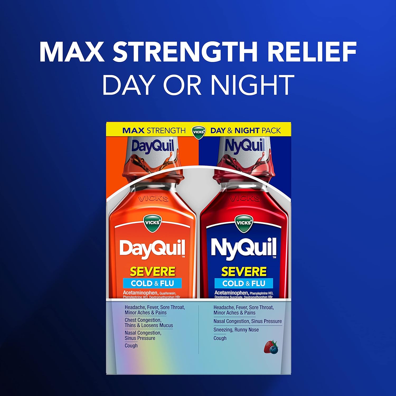 MULTI-SYMPTOM RELIEF from the World's #1 Selling Cough & Cold Brand. Vicks NyQuil SEVERE is the nighttime, sniffling, sneezing, coughing, aching, stuffy head, fever, BEST SLEEP WITH A COLD, medicine. Vicks DayQuil SEVERE is the daytime, coughing, sneezing, aching, stuffy head, fever, sore throat, congested chest, POWER THROUGH YOUR DAY, medicine