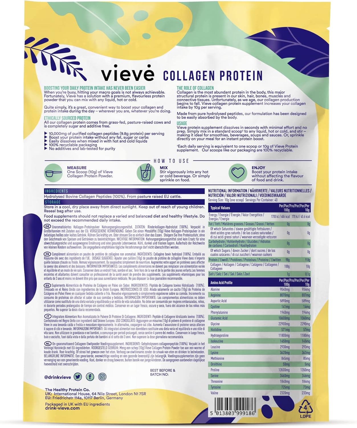 Vieve Collagen Protein Powder - Hydrolysed Bovine Peptides - Diet Support Supplement For Skin, Hair, Nail Health - Non-Gmo, Eu Grass-Fed, Pasture-Raised Cattle - No Dairy Or Sugar, Flavourless, 400G